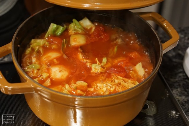 肉に焼き目をつけたら、玉ねぎと炒めて水を足して30分ほど煮て、そのあと他の野菜とトマト缶とコンソメ・ローリエを入れて、1時間半ぐつぐつ。