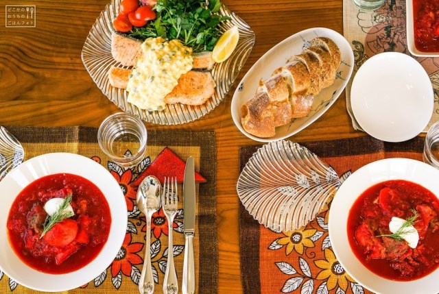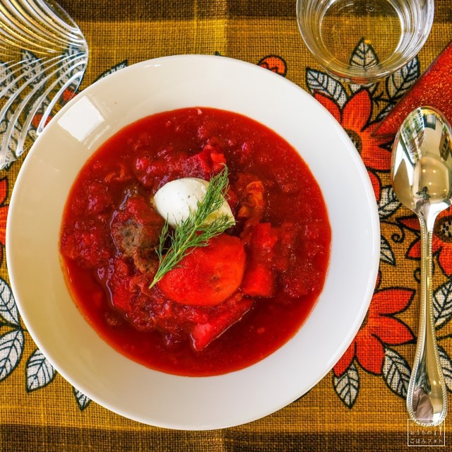 ボルシチは、色から想像するよりずっと優しい味で、牛すね肉もバッチリ柔らかくなっていました。美味しかったです、また作ろう!