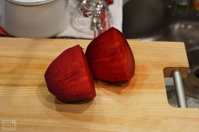 (余談ですが、真夜中にバイオハザードを見ながらビーツの下準備をしていたら、なんだかグロテスクなものを扱っている気持ちになりました。切るたびに赤い汁がドバーッとね。。。)