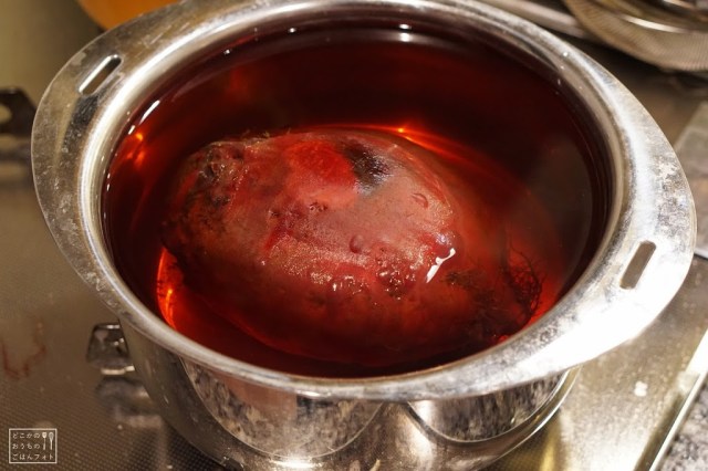 cookpadであれこれ調べたところ、どうやら最初に茹でている人が多かったので、皮を剥かずに丸のまま一時間ほど茹でてみました。汁、赤い…!そして一番大きい鍋でもはみ出る大きさ…!