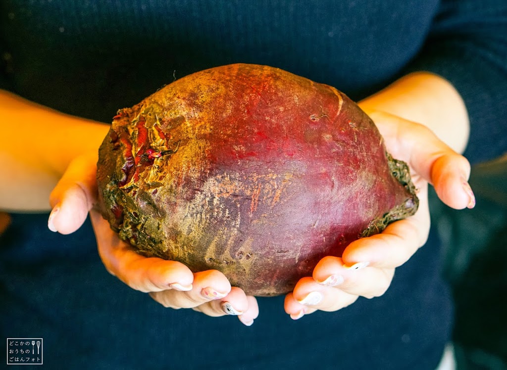 先週末、大井町に遊びに行ったら大きいスーパーがあって、初めて生のビーツに出会いました。こんなに大きいビーツ、600円。