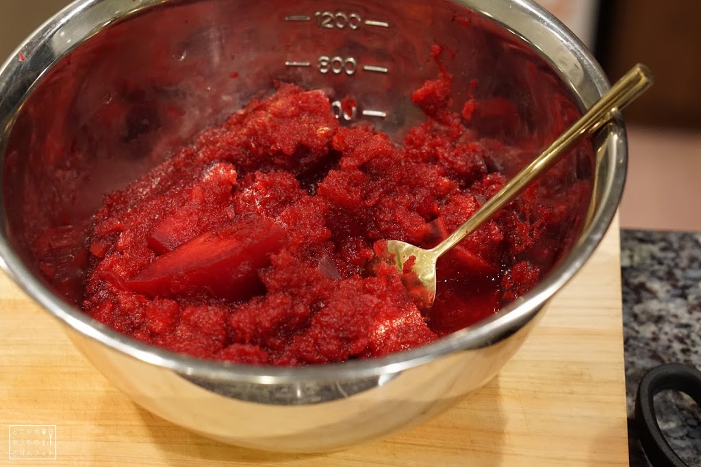 (余談ですが、真夜中にバイオハザードを見ながらビーツの下準備をしていたら、なんだかグロテスクなものを扱っている気持ちになりました。切るたびに赤い汁がドバーッとね。。。)