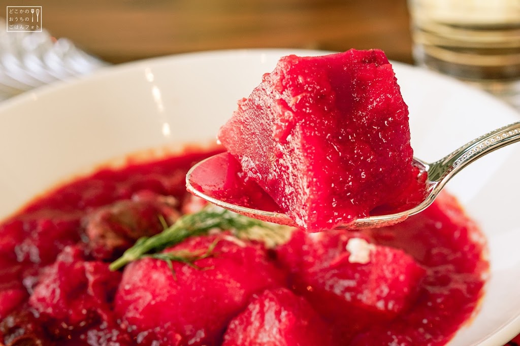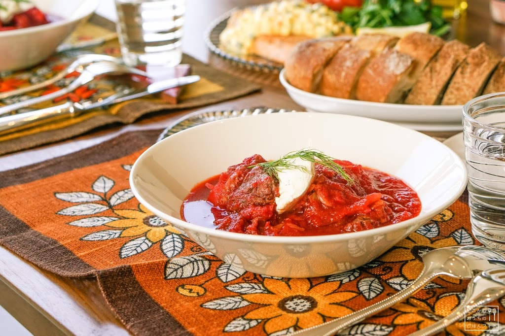 ボルシチは、色から想像するよりずっと優しい味で、牛すね肉もバッチリ柔らかくなっていました。美味しかったです、また作ろう!