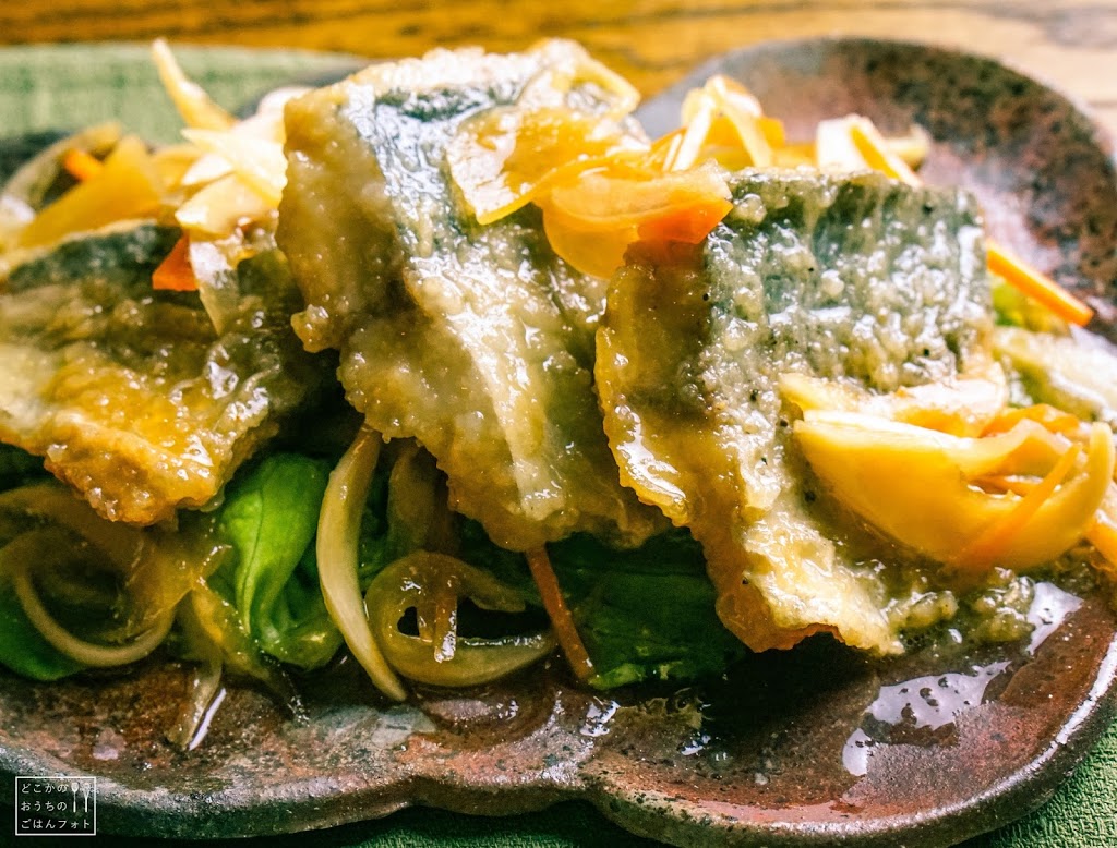 三枚におろしたアジはそれぞれ半分に切って、塩コショウ片栗粉をつけて揚げて、新玉ねぎのスライス、春人参の千切りとともに南蛮漬けにしました。