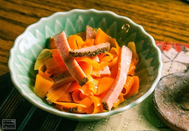 春人参をピーラーで剥いて、サッと湯がいて、ハムと、オリーブオイル・酢・塩で和えました。おいしっ!