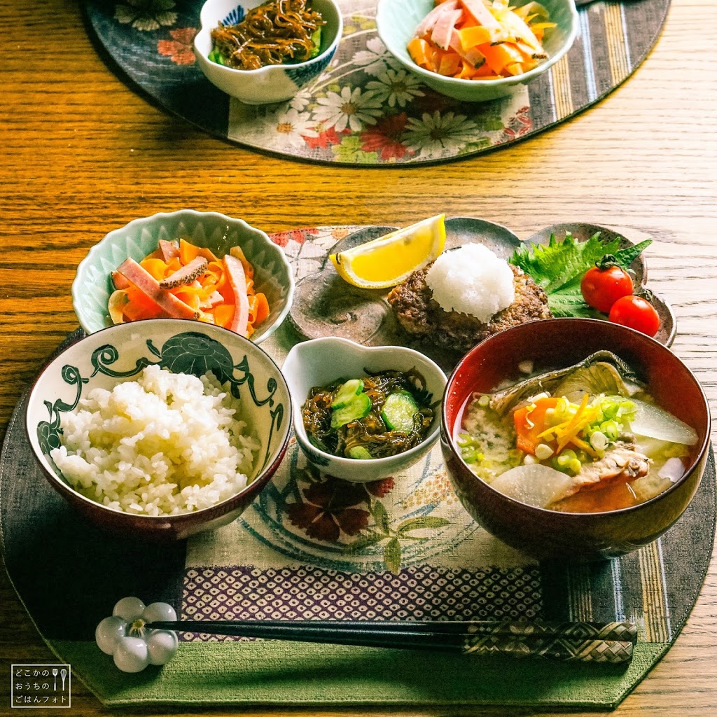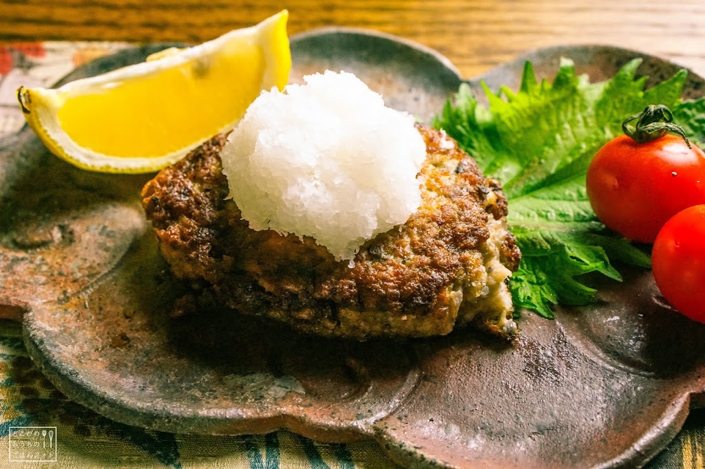 ハンバーグは、大根おろしを乗せてえごまポン酢をかけて。