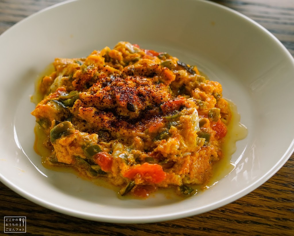 メネメンは、ピーマンのみじん切りをオリーブオイルで炒めたら、トマトをみじん切りを加えて10分ほど弱火で煮込んで、塩を加えた溶き卵を流しこんだら強火にして、細かく混ぜ混ぜ。完全に火が通る前に火からおろして盛りつけ。