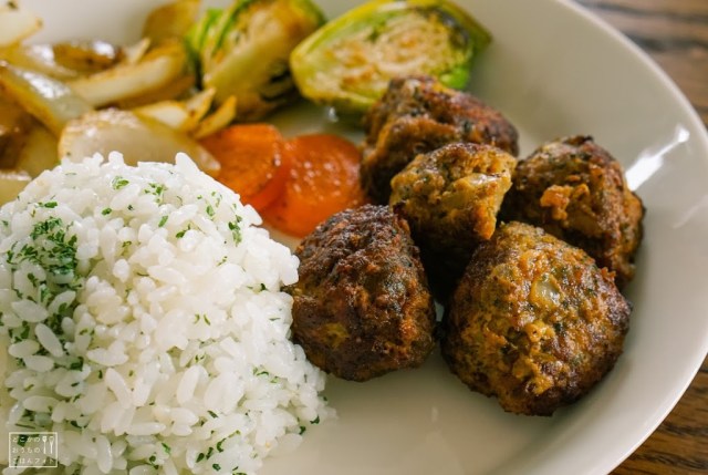 キョフテは、牛ひき肉、豆乳にひたしたパン粉、卵、玉ねぎみじん切りに、チリパウダーと乾燥パセリをどっさり加えました。粘り気が出るまでこねて、小さいお団子状にしてフライパンでこんがり焼きます。