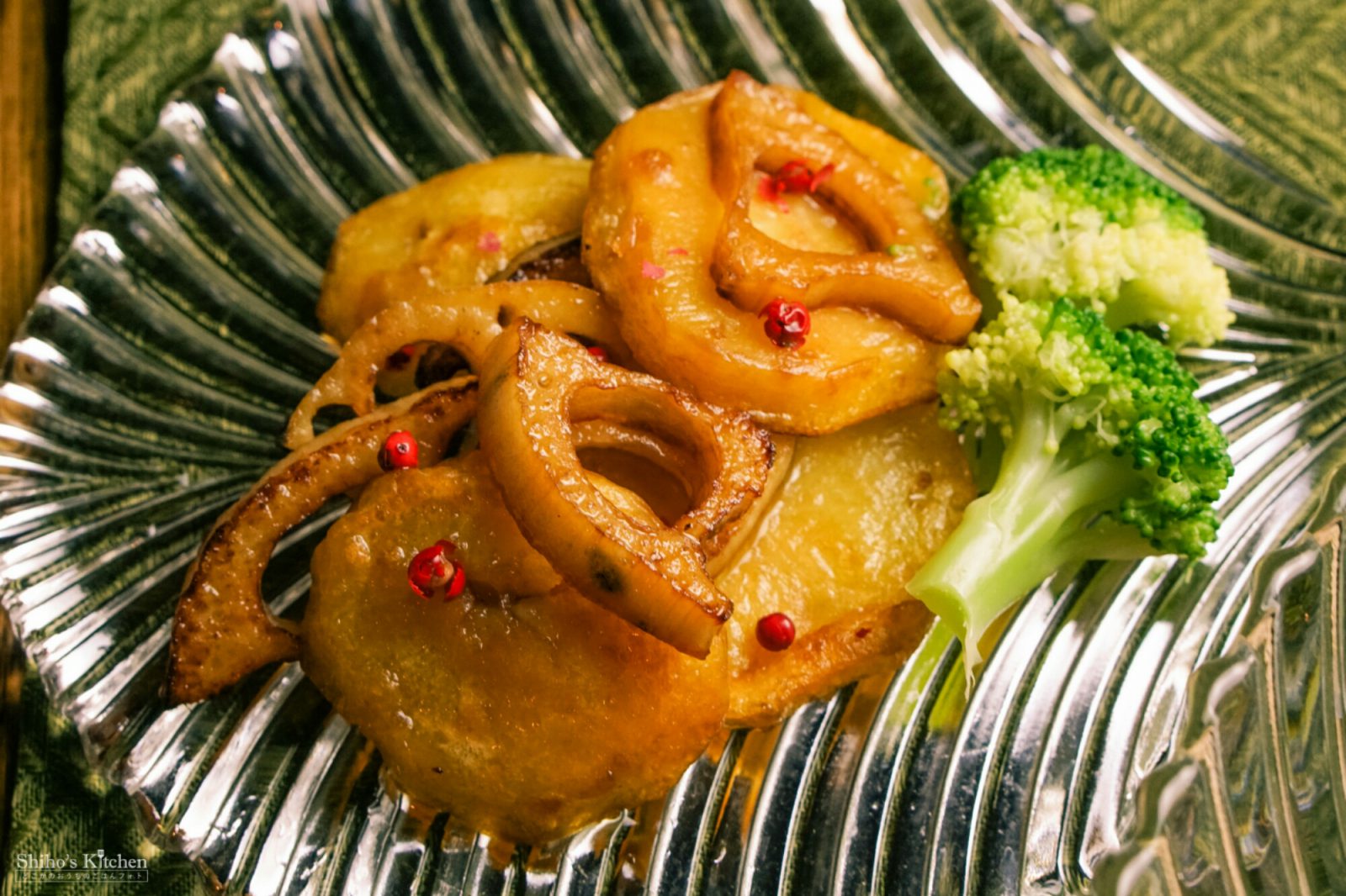 安芸津のじゃがいもは、赤じゃがという種類らしく、ねっとり味が濃くて普段買うのとは一味違うのです。チンして柔らかくしてから、蓮根と一緒にフライパンで焼きめをつけて、冒頭の牡蠣ドレッシングでマリネに。