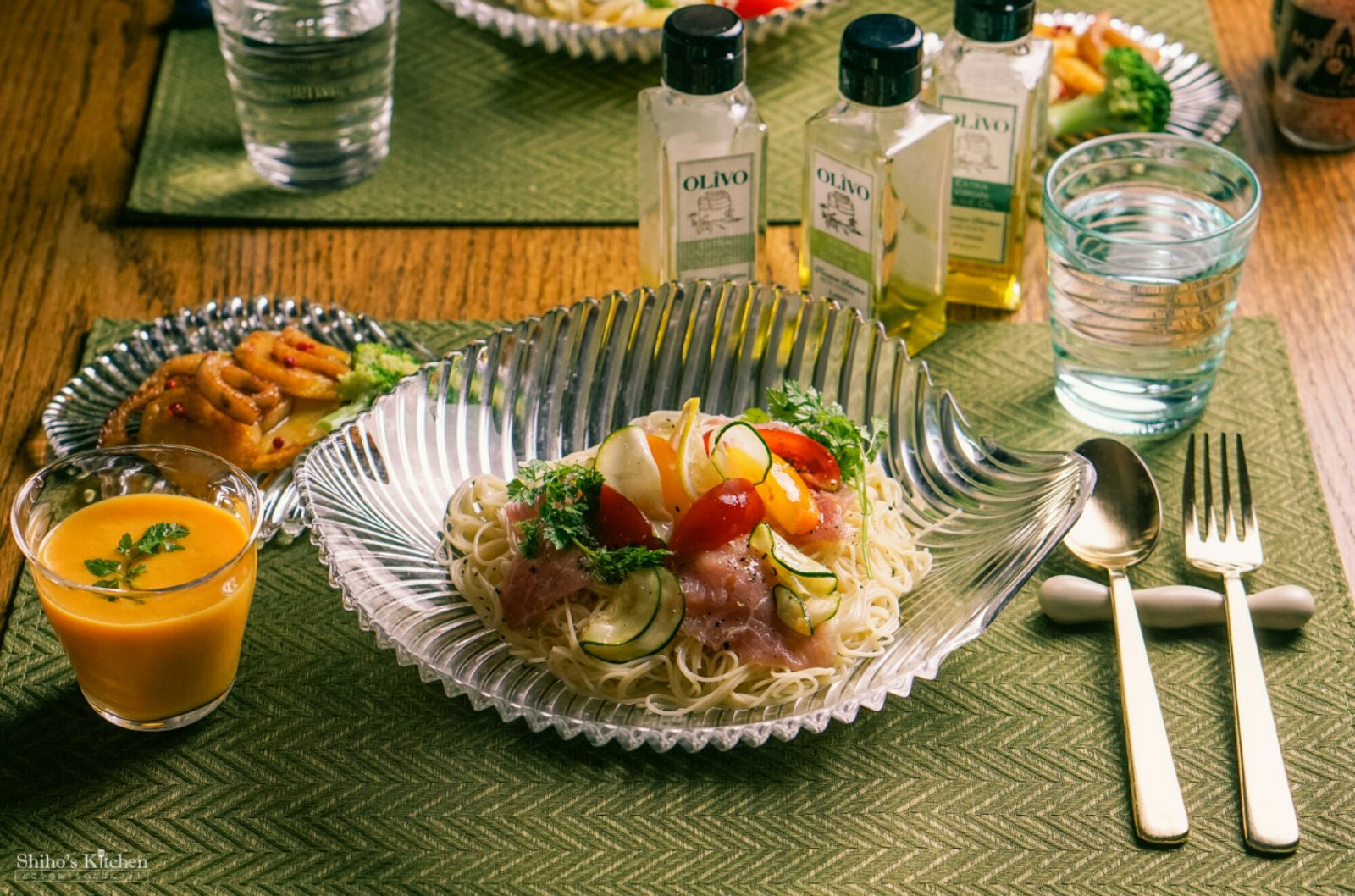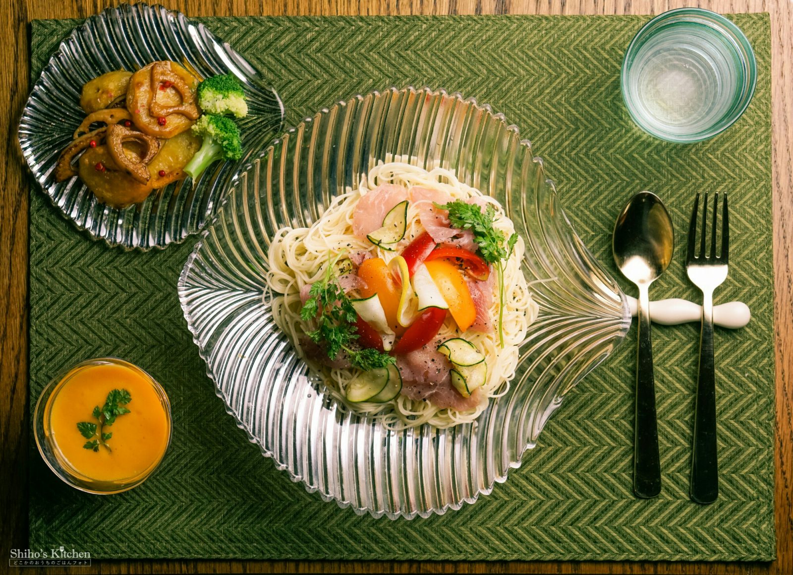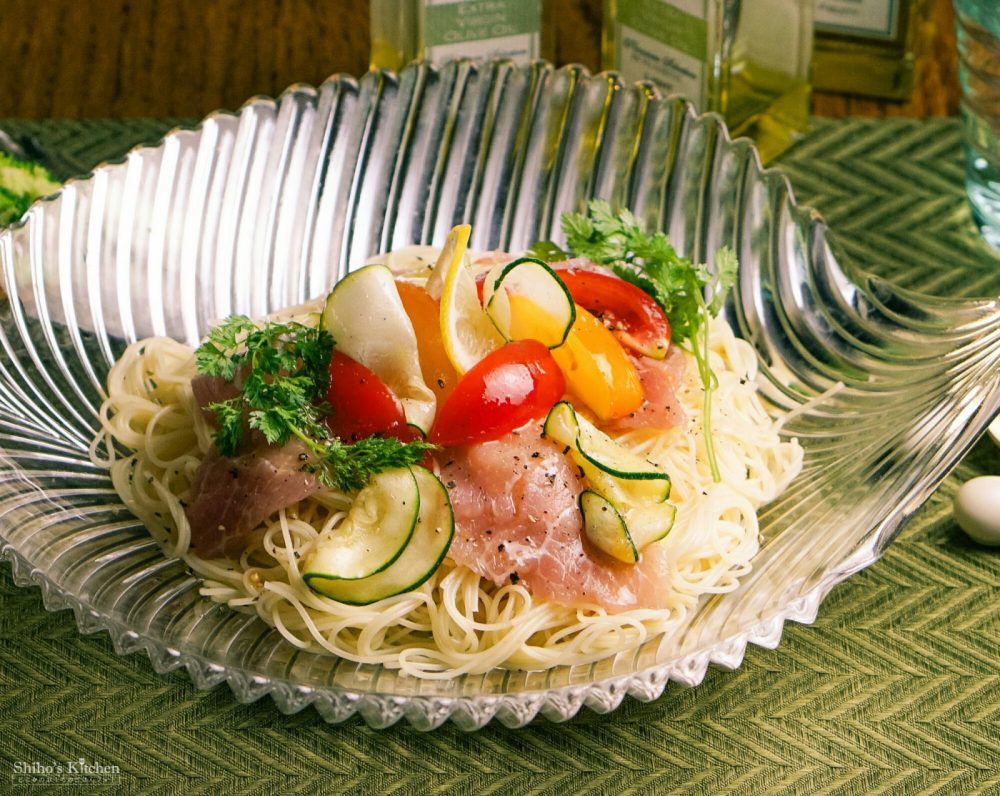 カッペリーニを2分弱茹でてすぐに氷水でしめたら、生ハムとズッキーニをソースと一緒にふんだんに混ぜ込んで、黄色と赤のアイコトマト、チャービルを飾りました。