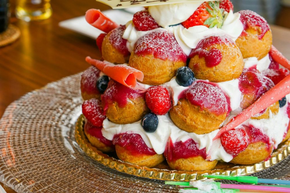シュークリームが山のように積み重なって豪華!!!みんなで突っついて食べました。