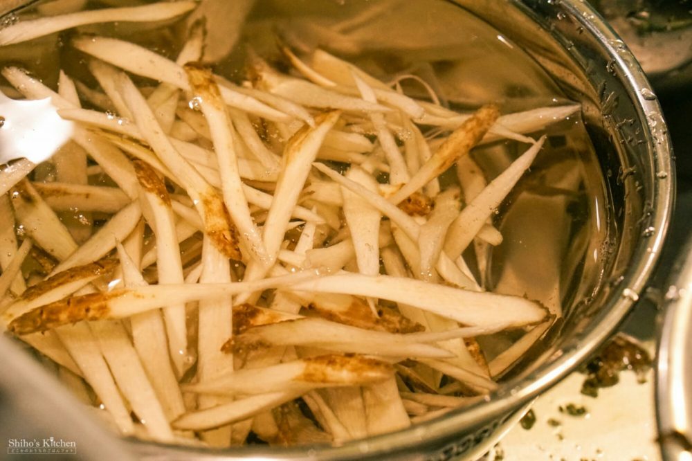 ゴボウは…うっかり水にさらしすぎたら、味も香りも全くない残念な新食材に…こんなに色々抜けちゃうのね…幸いもう一本冷蔵庫にあったので、ささがきをイチから作り直しました。牛肉ゴボウって、温玉と混ぜるととすきやき味になりますね。