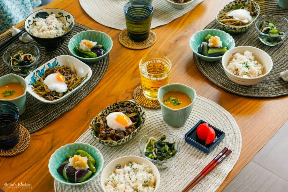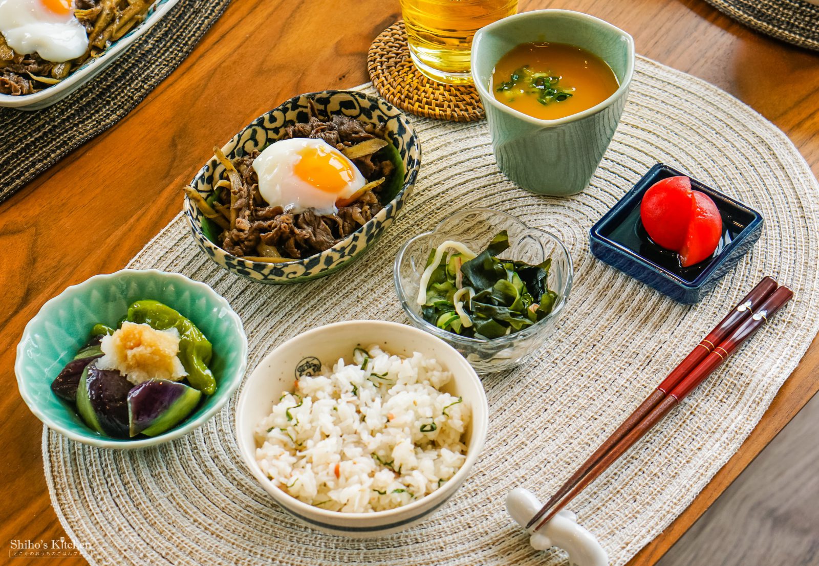 ごはんには、ちぎった梅干し、千切りの大葉、しらす、白ごまを混ぜ込みました。簡単だけど、ごはんの熱で大葉の香りが立って美味しいよ。