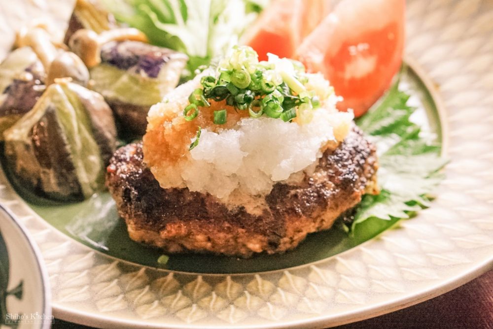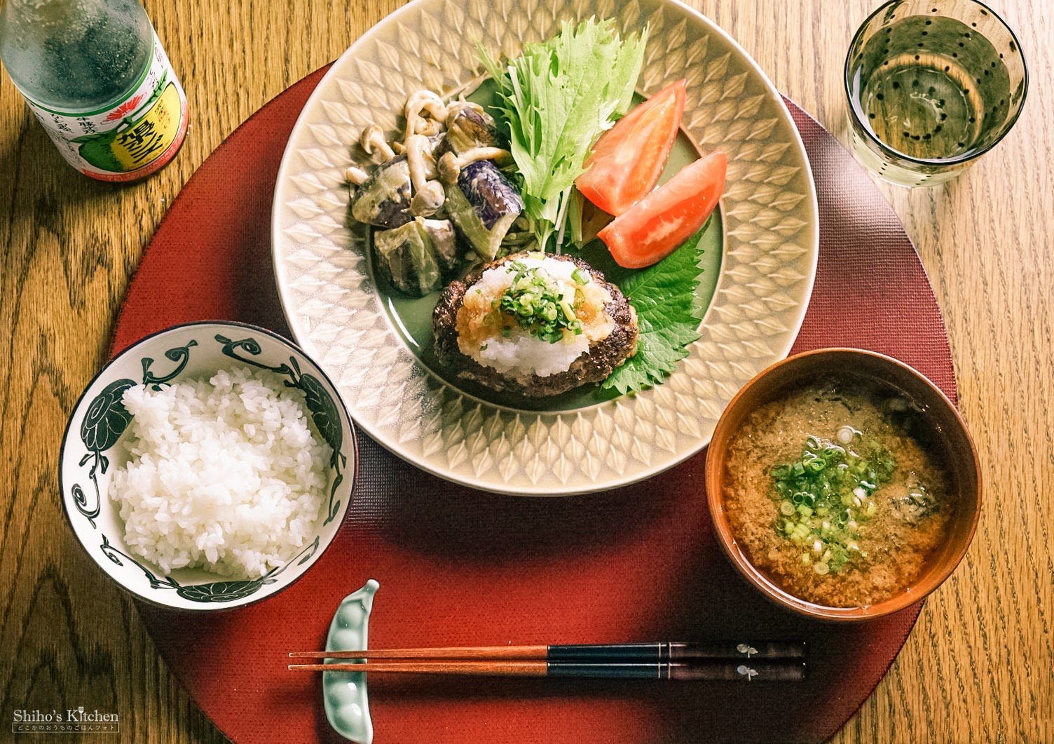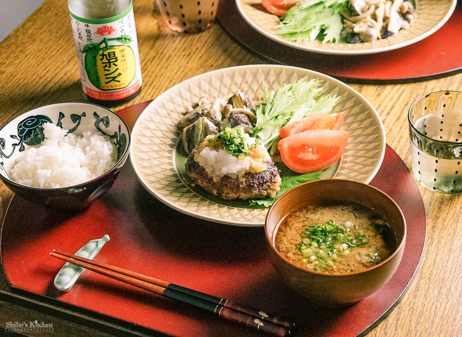 予想通り、これは合う!大根おろしといただいてもよし、飽きたらマヨポン味でちょっとコクのある茄子やしめじといただいてもよし、二度美味しいハンバーグになりました。
