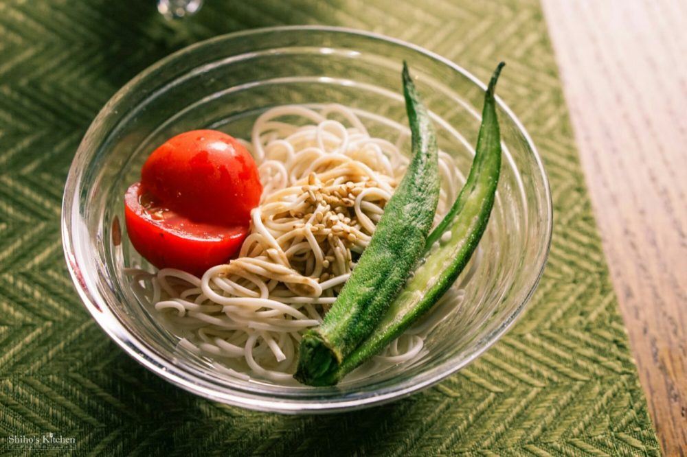 先週食べそびれたコンビニのお豆腐素麺とOisixのあめトマト&丸オクラは胡麻ダレでいただきました。