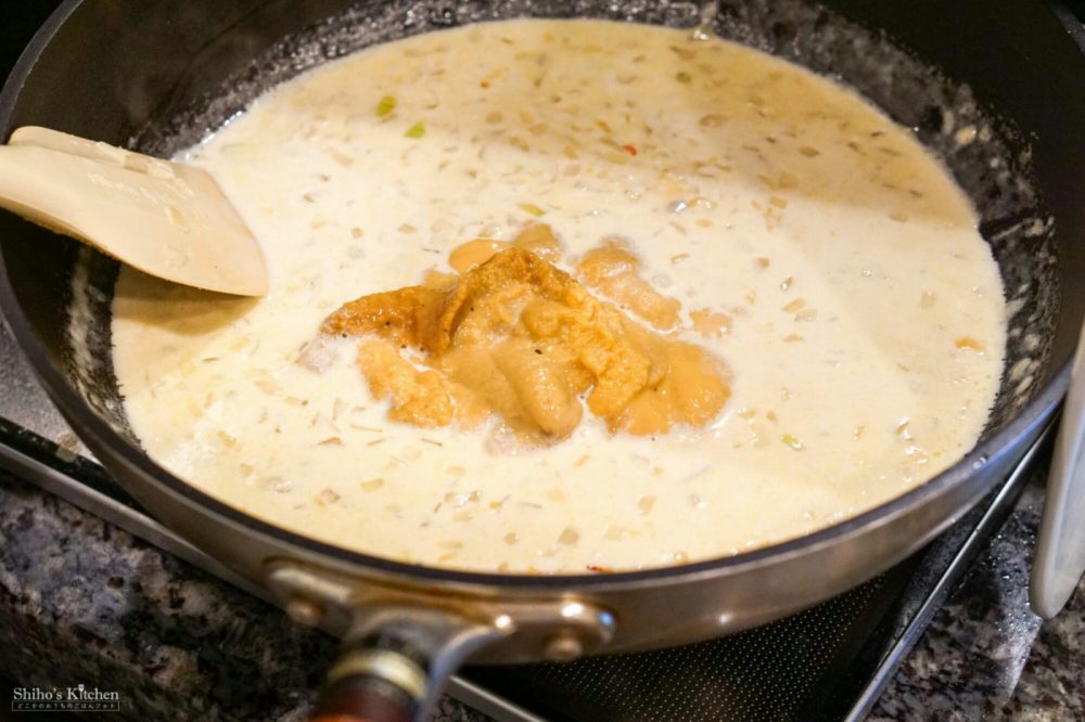 普段は生クリームなんてカロリーにビビってめったに使わないのですが、今日はウニ様に敬意を表してふんだんに投入。