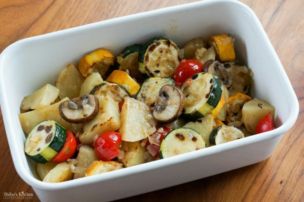 ③好きな野菜を焼いてボウルに入れていく。今回は、緑・黄のズッキーニ、ジャガイモ、マッシュルーム、ミニトマト。軽く和えたらしばらく馴染ませて出来上がり。すぐ食べるなら常温でも、作り置きなら冷蔵庫で冷やしても美味しい。