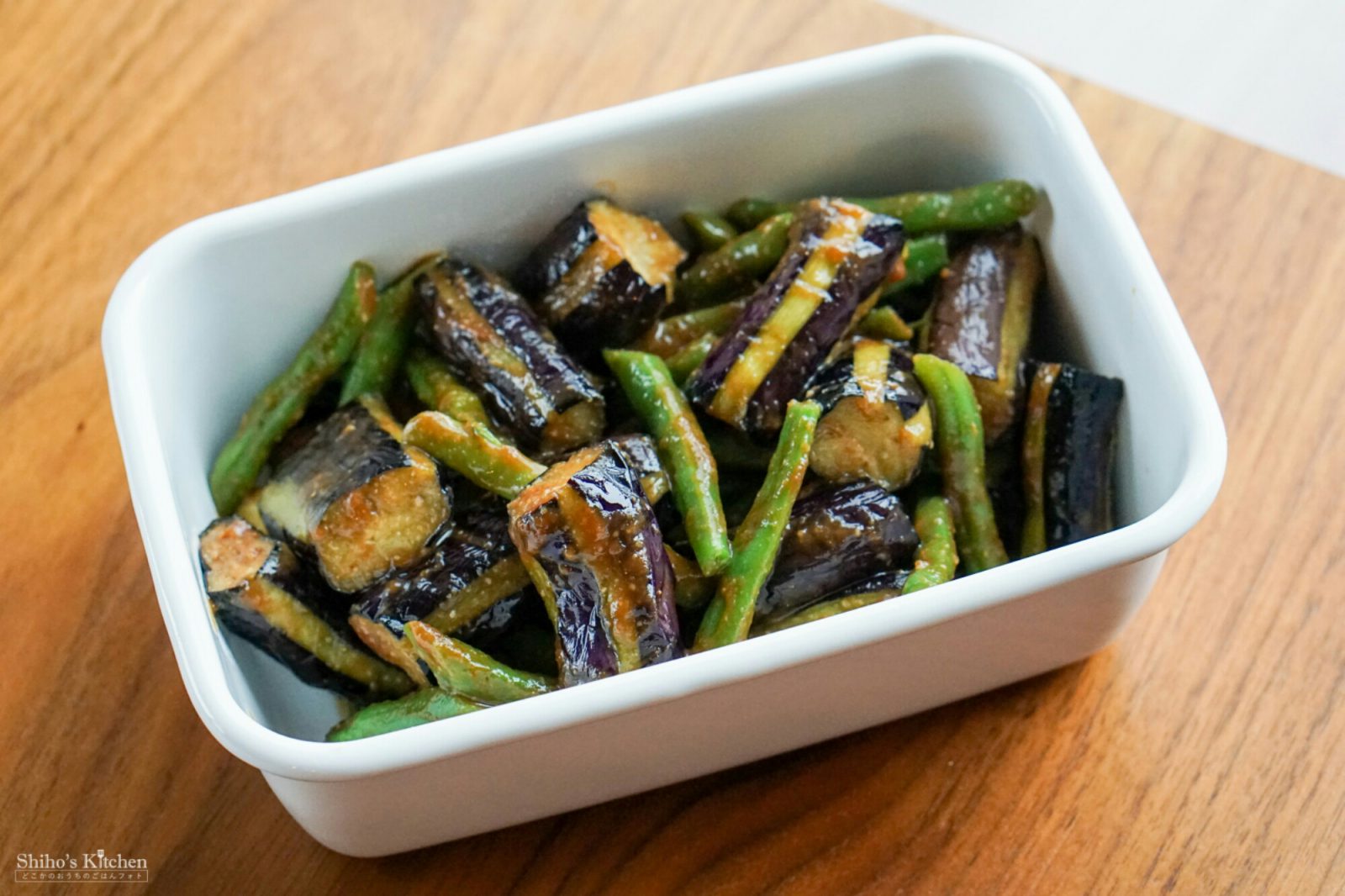 ③調味料をすべて混ぜておいて、茄子・インゲンが熱いうちに和える。茄子を崩さないように。
