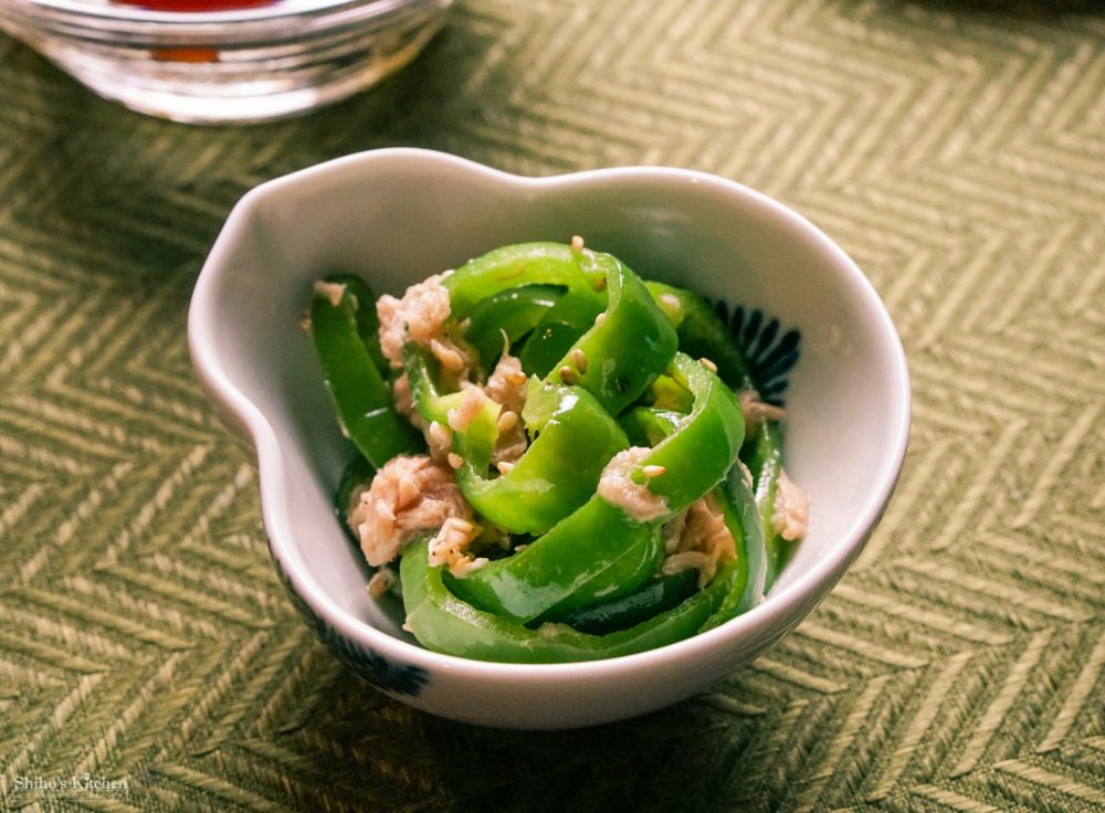 5mmの輪切りにしたピーマン、油を切ったツナ、鶏ガラスープの素、ごま油、塩コショウを耐熱ボウルに入れて2分チン。以上!
