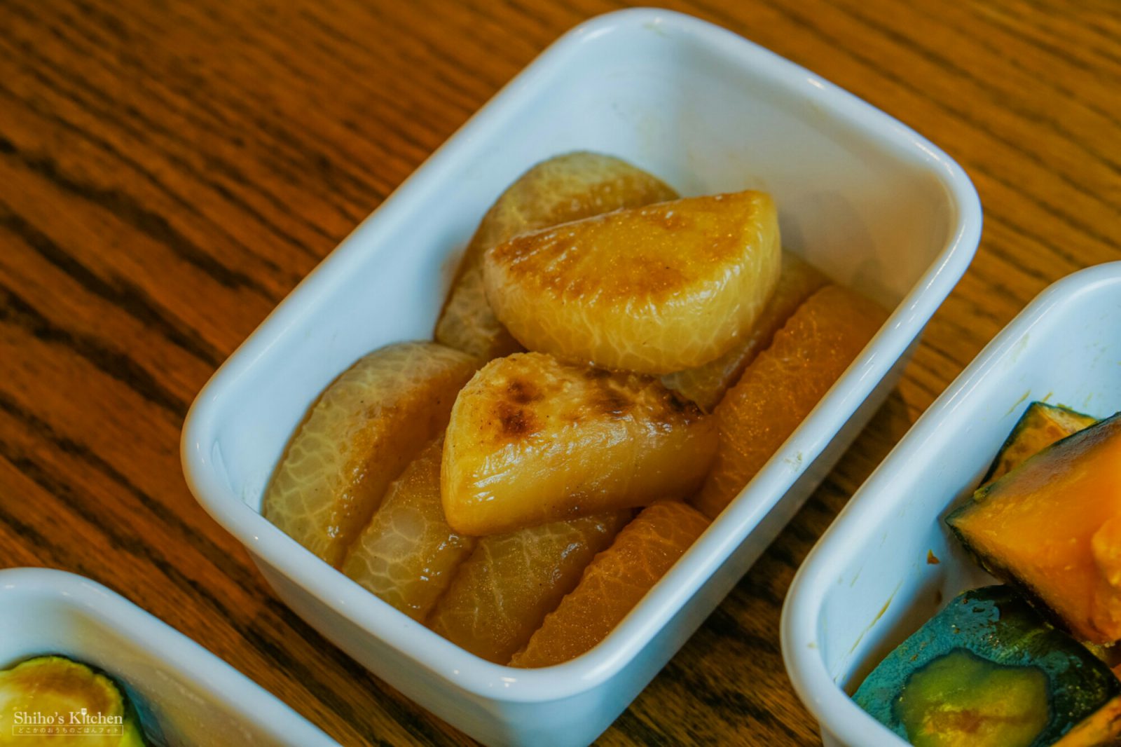 こちらのレシピを参考に、面取りした大根をレンチンして、バターで焼き目をつけて、旭ポンズを絡めて煮詰めて。作り置きしたら味が染みるんじゃないかなーって。