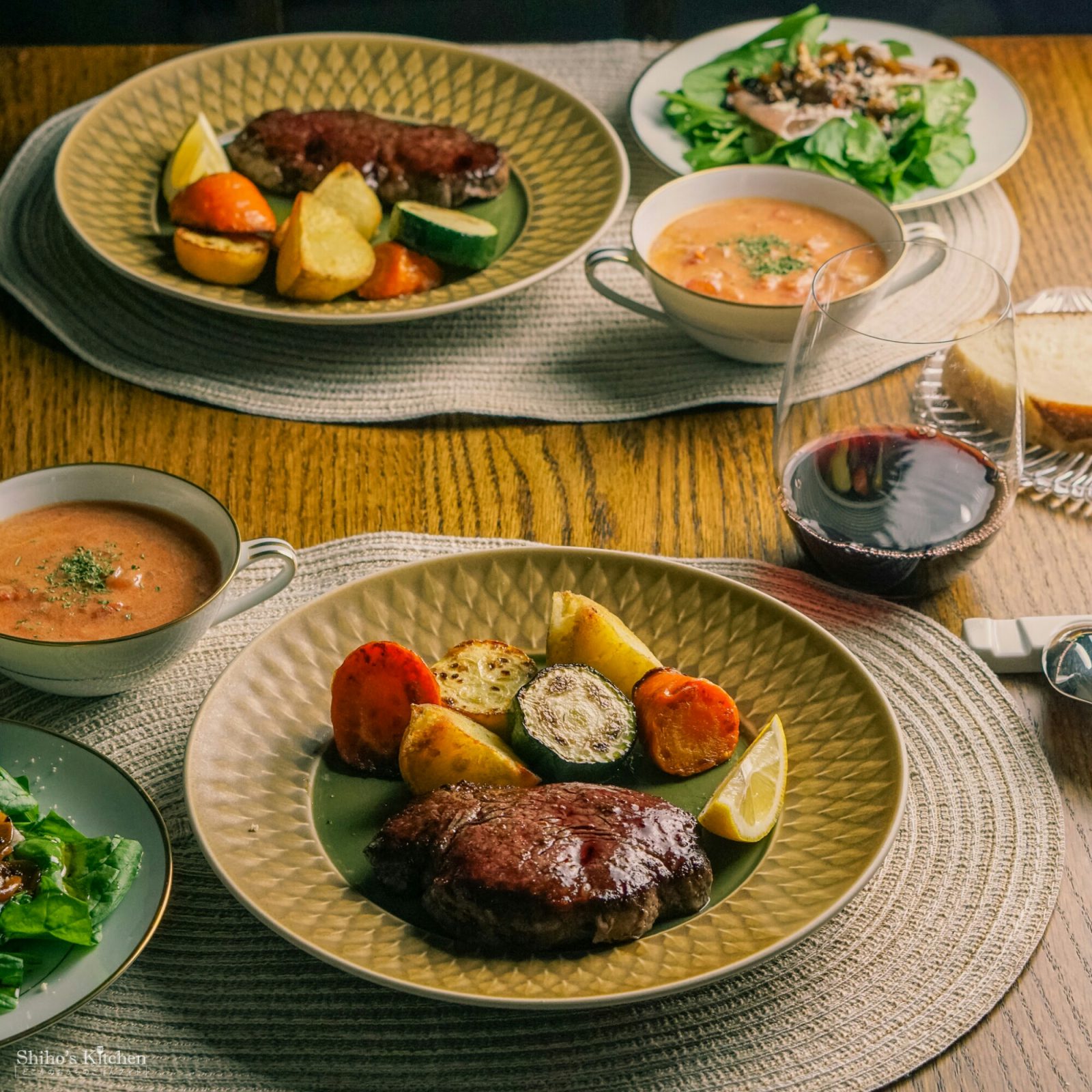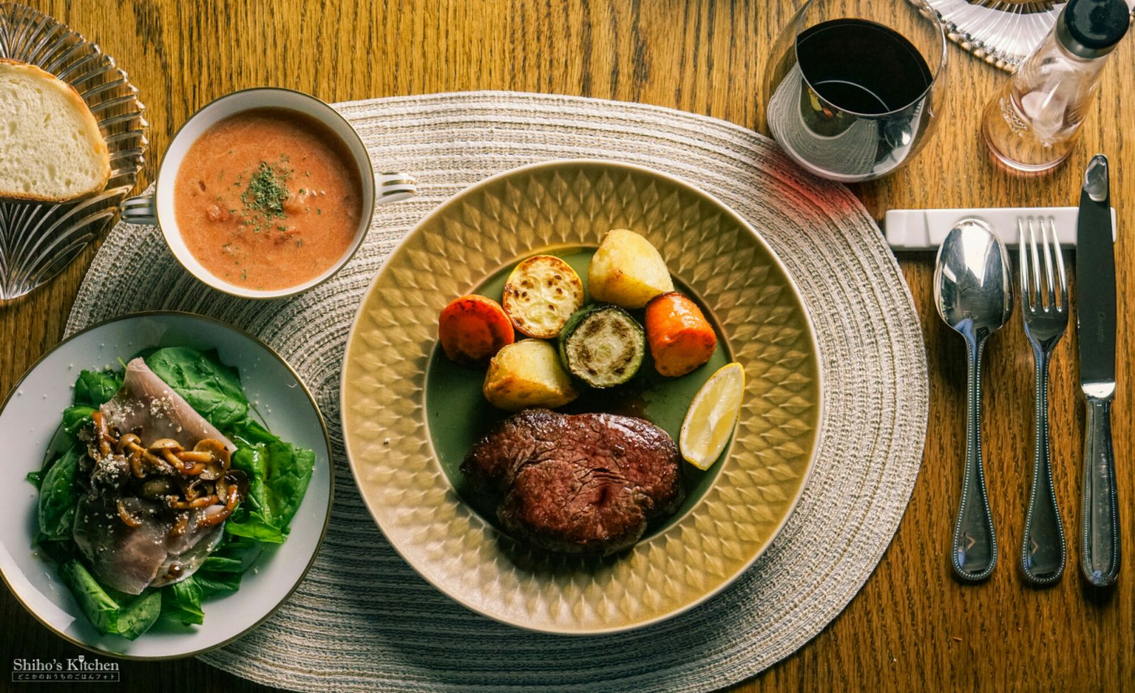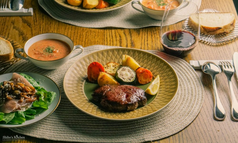「赤ワインとステーキ」からサイドディッシュを考え始めて、献立はこうなりました。