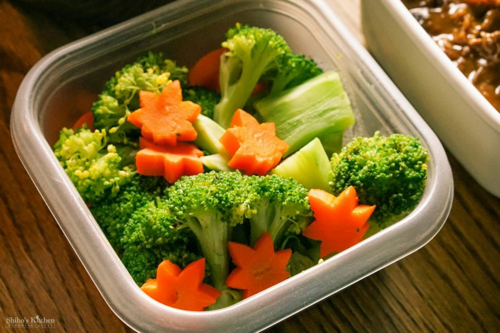 別茹でしたブロッコリーと人参も、食べるときに載せます。