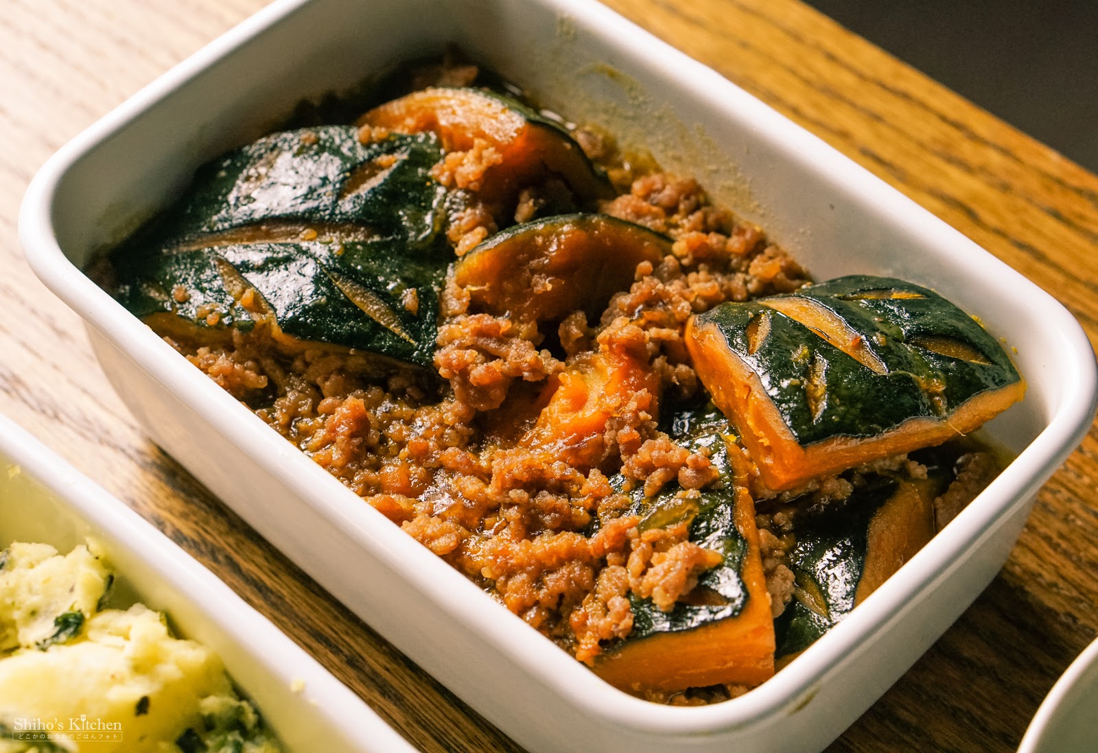 Oisixでまっ栗かぼちゃを丸ごと1つ買ったので、半分はそぼろ煮、半分はシチューに。