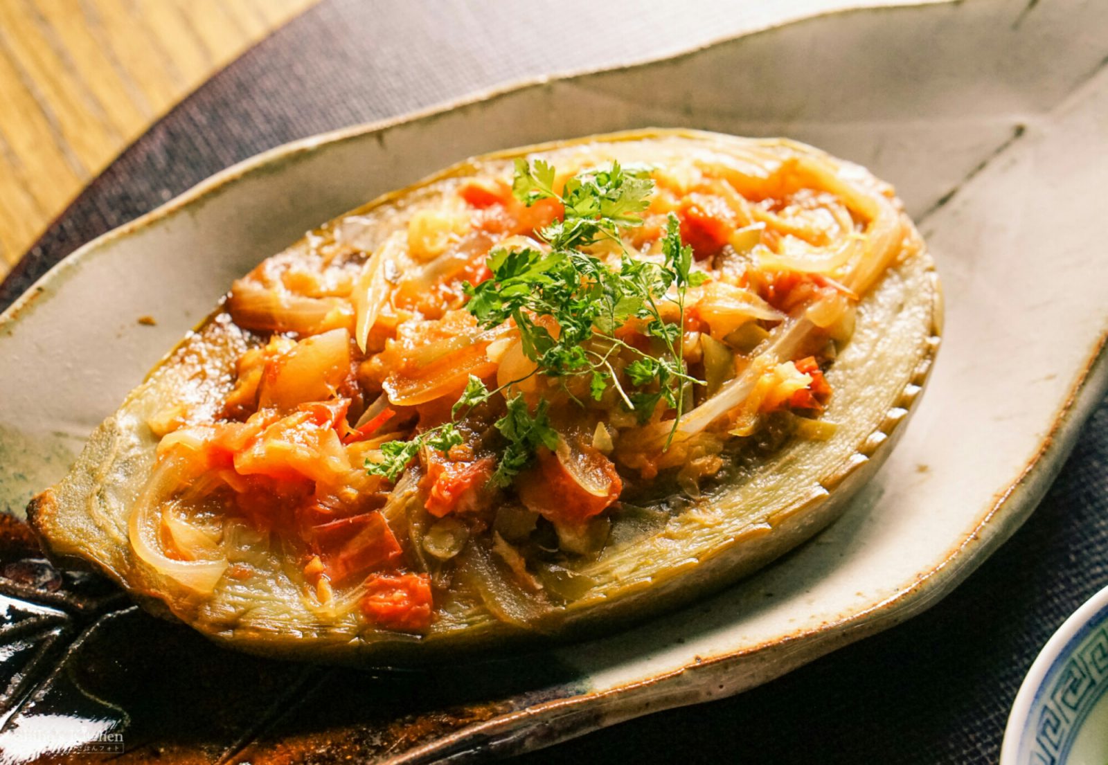 いろいろ出回ってるレシピを総括すると、オリーブオイルで丸ごと焼いたナスに切れ目を入れて、ニンニク・玉ねぎ・トマトを刻んで炒めたものを挟んで、水を注いだフライパンで20-30分蒸し焼きにする、という料理です。