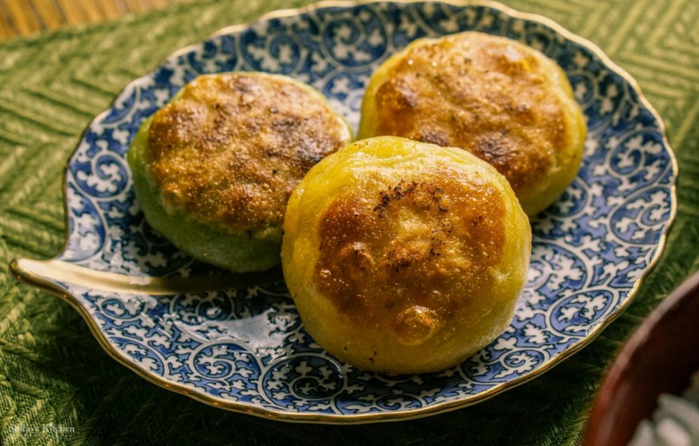 冷凍とうもろこし餃子とほうれん草餃子をこんがり焼いて、