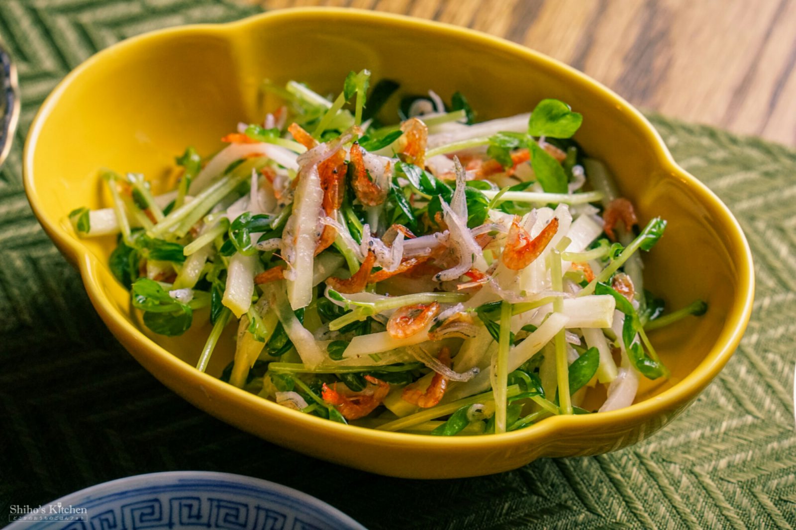 圧倒的に野菜不足なので、まずは生野菜サラダ。コールラビという謎野菜と豆苗とシラスと桜えびを、亜麻仁油と塩麹で和えました。(あ、そうそう、この小鉢はひさしぶりの新入りです。赤坂陶香堂さんの!)