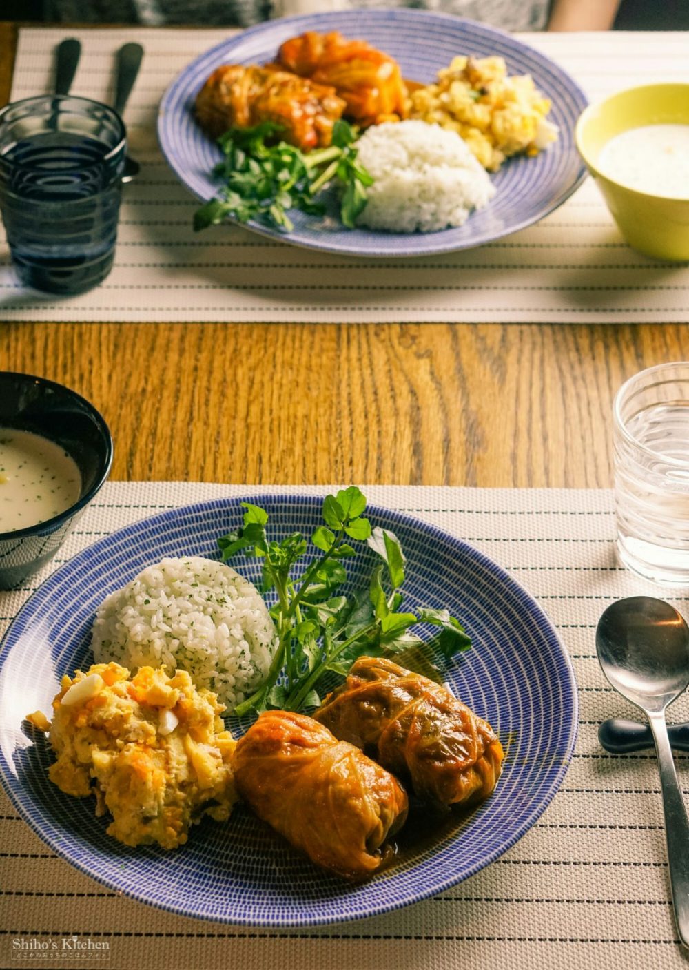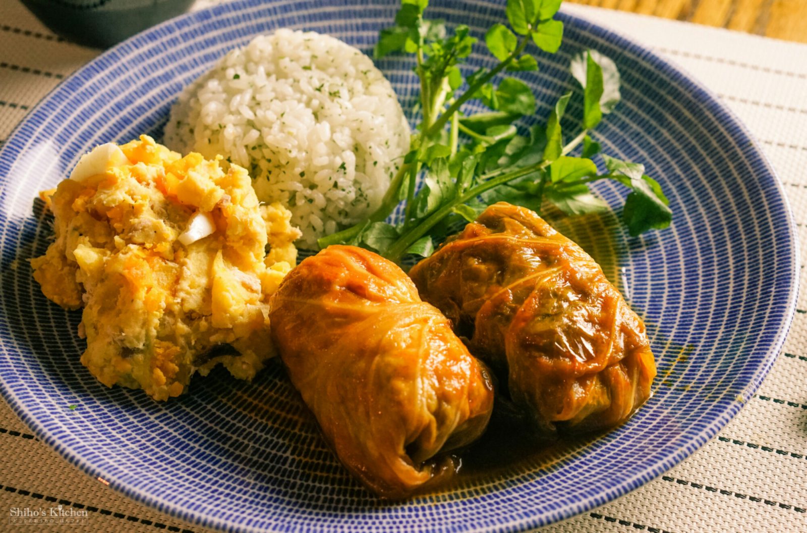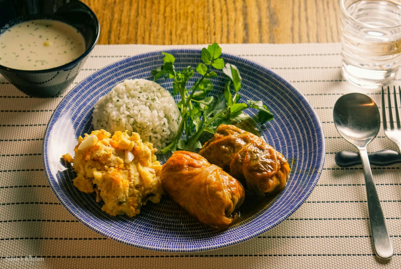 ごくごく普通のロールキャベツの出来上がりです。パセリバターライス、バル風ポテサラ、クレソンを添えて。