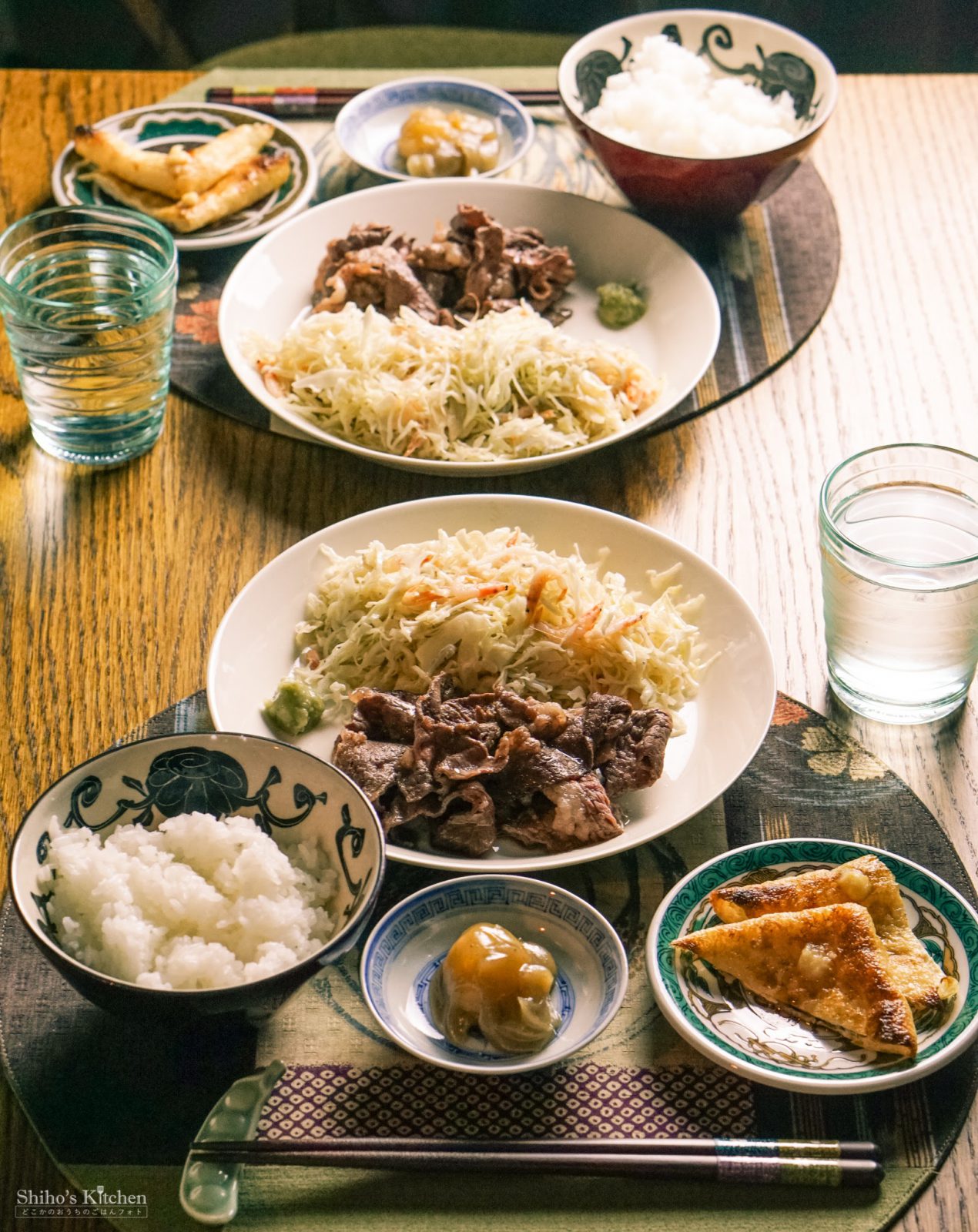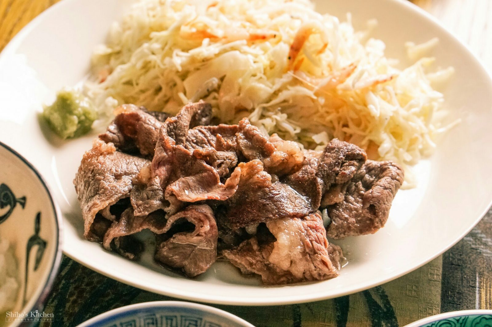 焼肉もどき(いや、肉を焼いてるから焼肉でいいのか…)は塩コショウでシンプルに味付けして、粗切りわさびをつけていただきます。