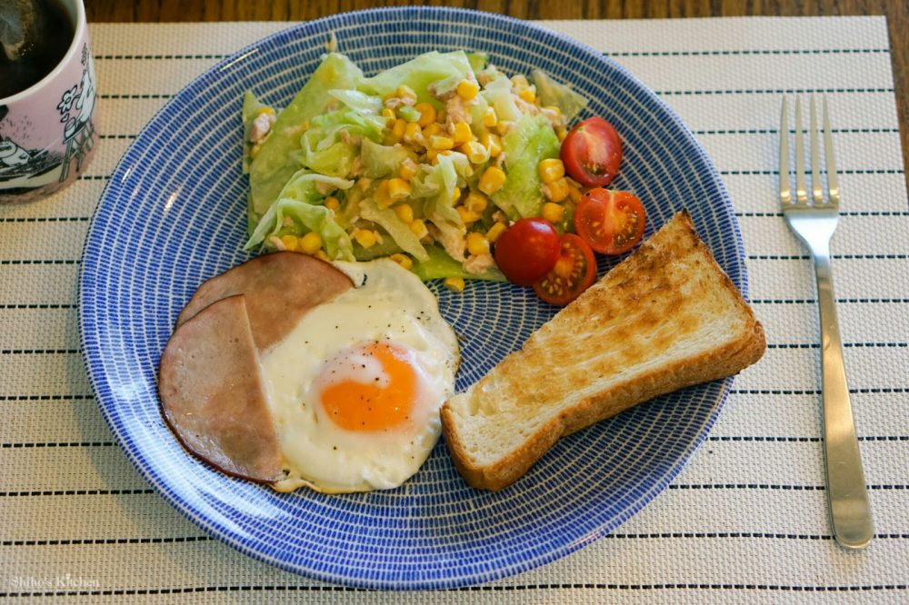 今日の朝ごはんは、茹でキャベツとツナとコーンのサラダ、ハムエッグ、トーストでした。なんのことはない。トーストをこのセラミック板焼き網で焼くのだけが、小さなこだわり。