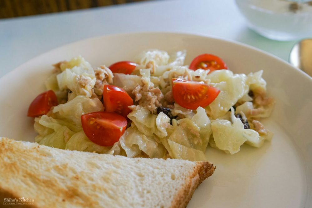 昨日に引き続き茹でキャベツのサラダ、今日はツナとレーズンを入れてオリーブオイルでさっぱりと。