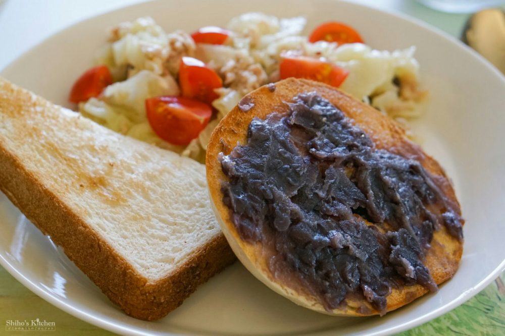 キャベツは丸ごとひとつ買って、半分をまとめてざく切りにして茹でてあるので、タッパーから出して和えるだけ。茹でキャベツ便利。