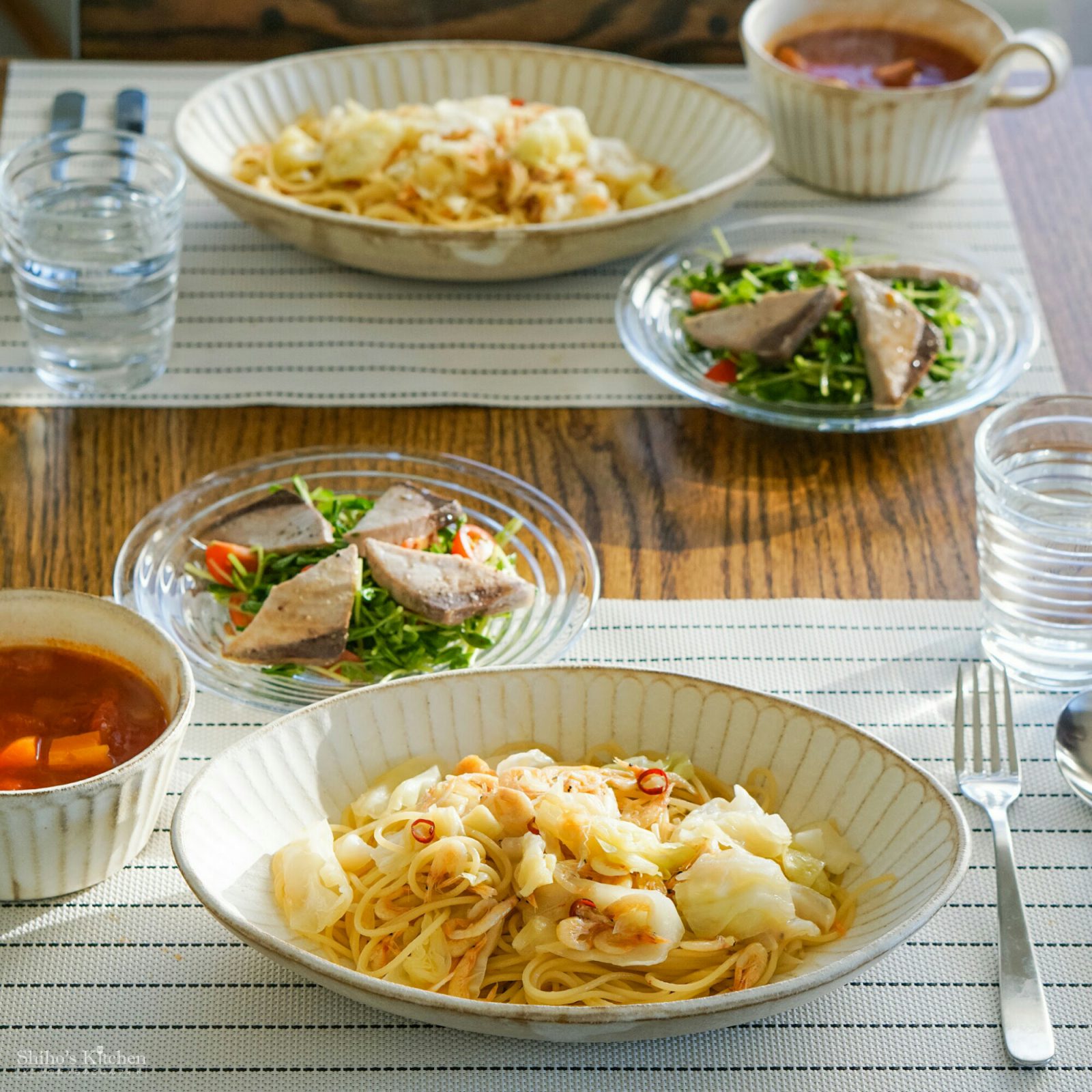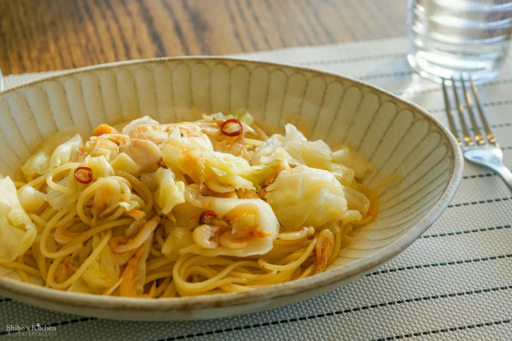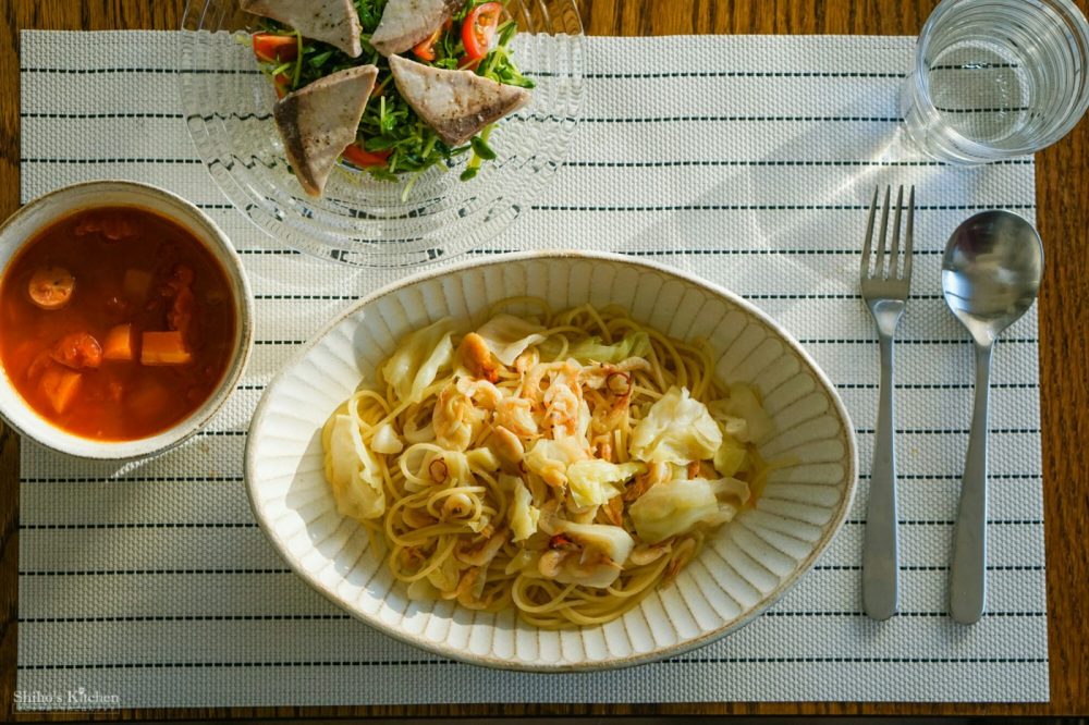 前日と前々日の朝はいろいろ和えてコールスローに、この日は桜えびと炒めて春らしいパスタに。