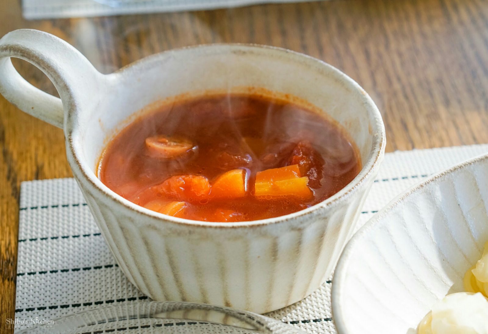 ゴロゴロ大きめの具を取り出して、さいの目切りにして戻したら、トマト缶・コンソメ・蜂蜜を足して他のお料理を作るあいだ弱火にかけておきます。