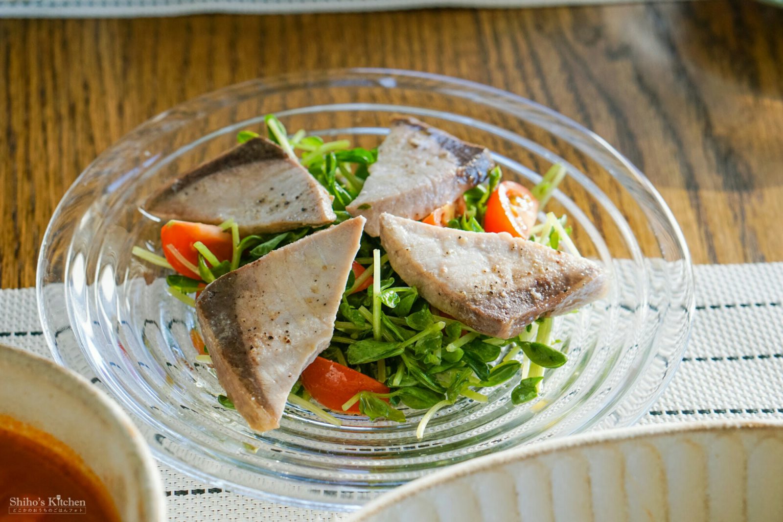 生の豆苗とミニトマトはオリーブオイル・きび酢・塩コショウ砂糖で和えて、塩コショウして焼いたブリのお刺身をのせました。