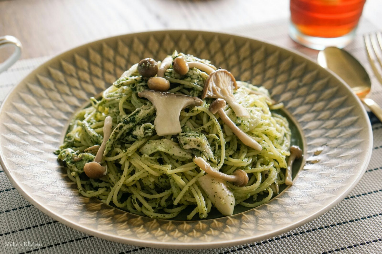 大葉をどっさり手に入れたので、薬味としてでなく主役として使いたいなぁと思い、ジェノベーゼ風のパスタに。名付けてシソベーゼ。