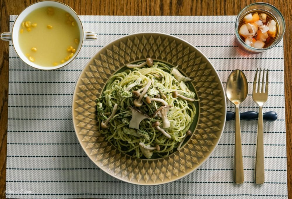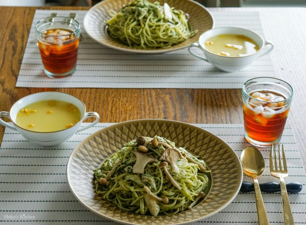 火が止まっていたからか、バジルでなく大葉だからか、加熱による緑色の変色は気にならず。