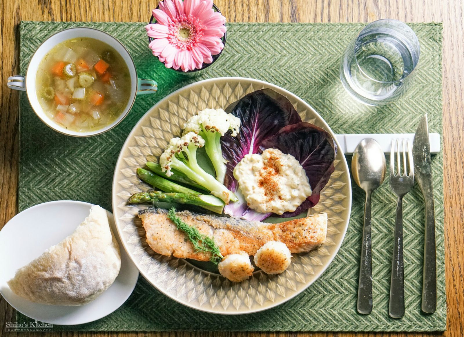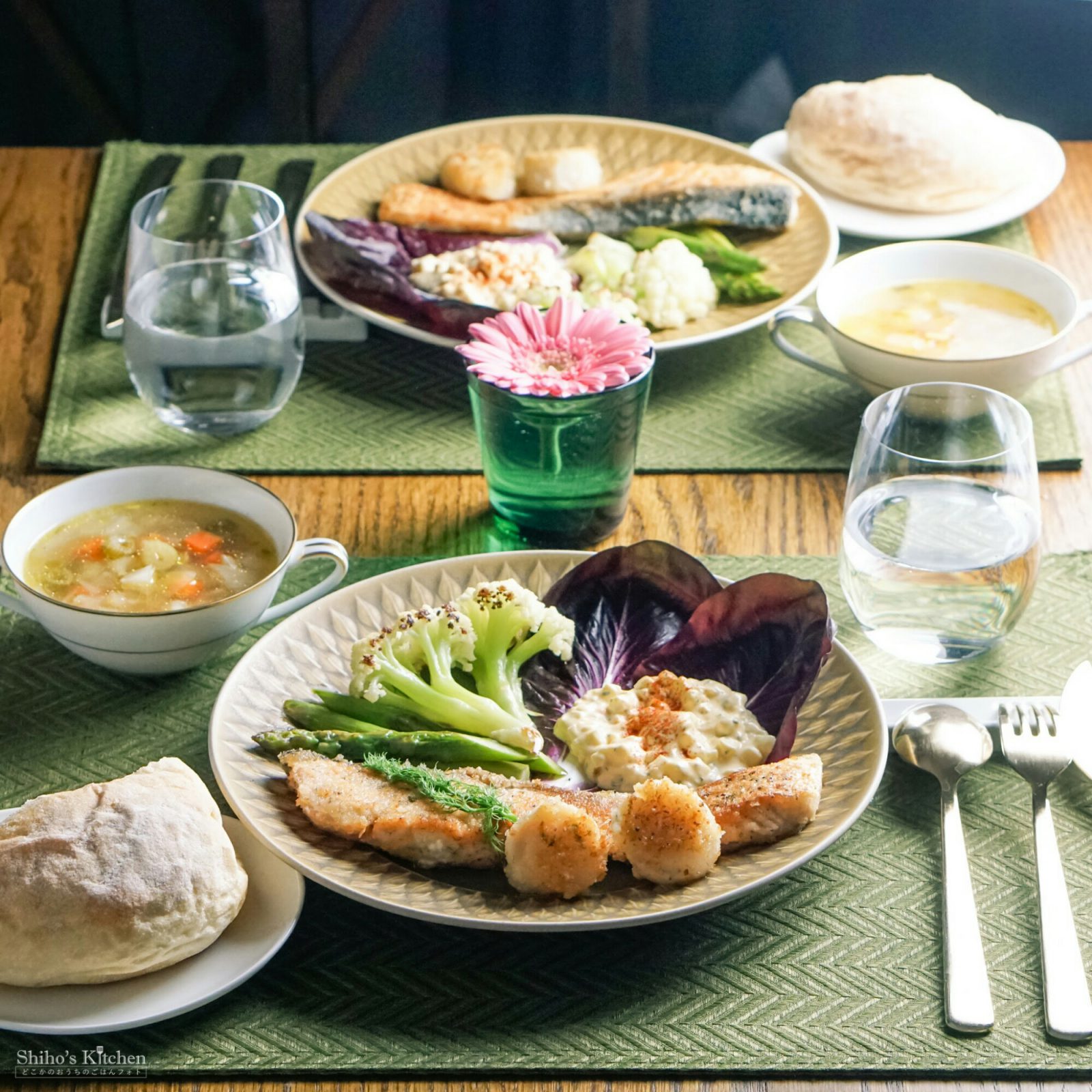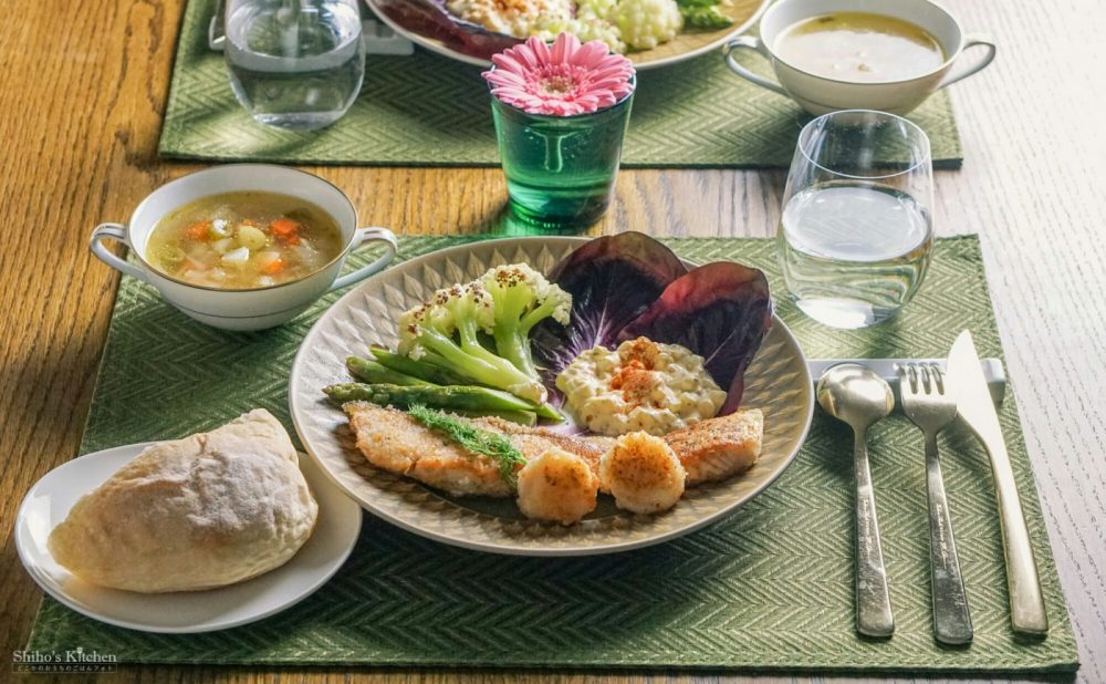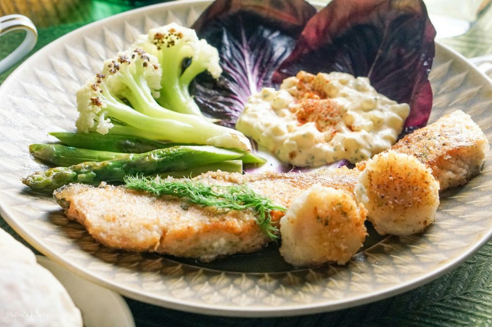 謎野菜3種に合わせたメインは、サーモンとホタテのパン粉焼き。