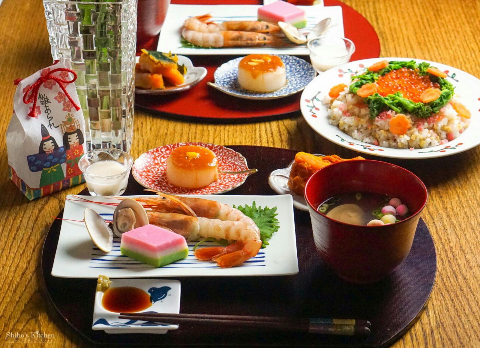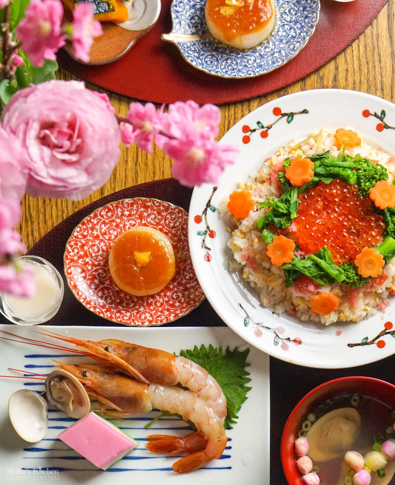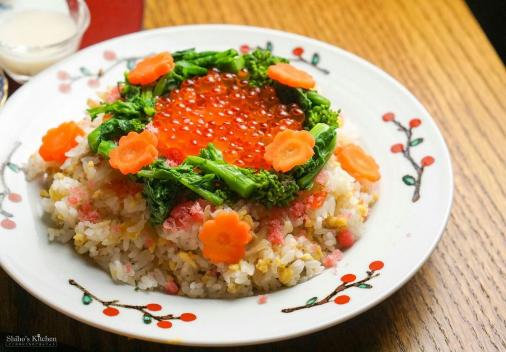 ちらし寿司は、ごはんに母のちらし寿司の具と寿司酢を混ぜ込んで、上に菜の花、人参、でんぶ、いくらをトッピング。