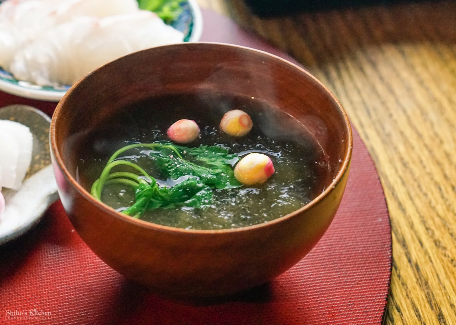 お吸い物は、蛤がなかったので、とろろ昆布と三つ葉と鞠麩。