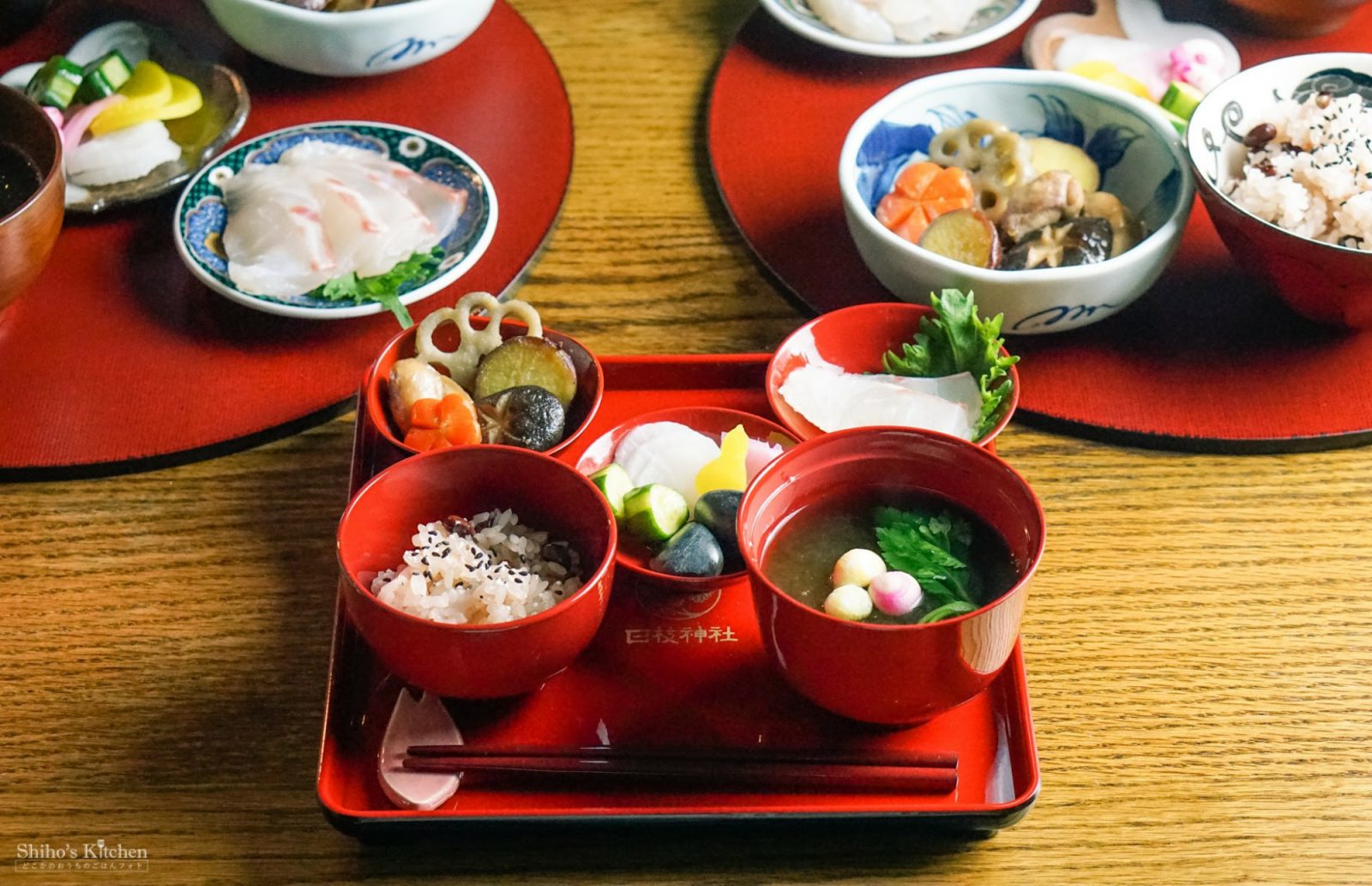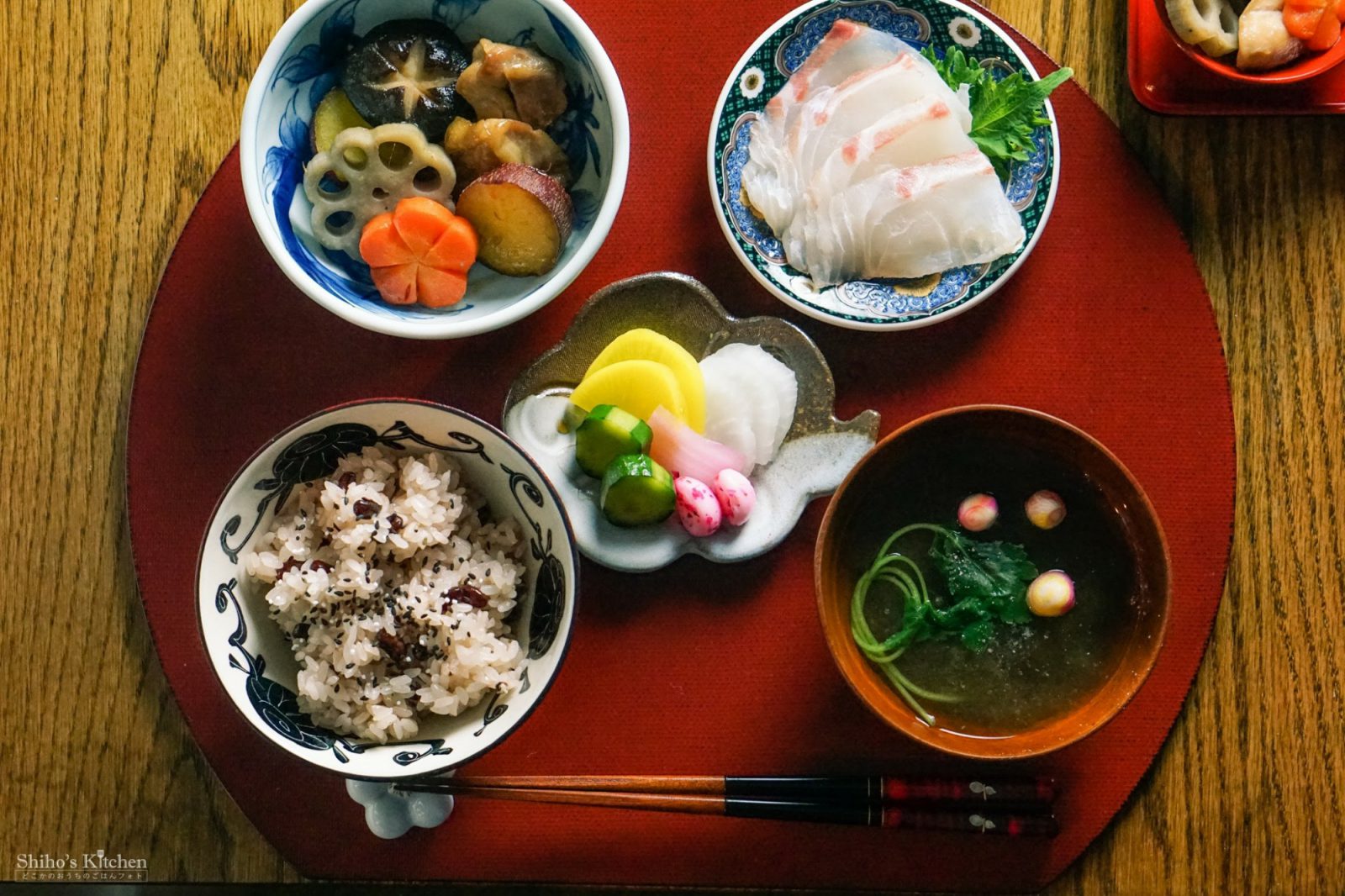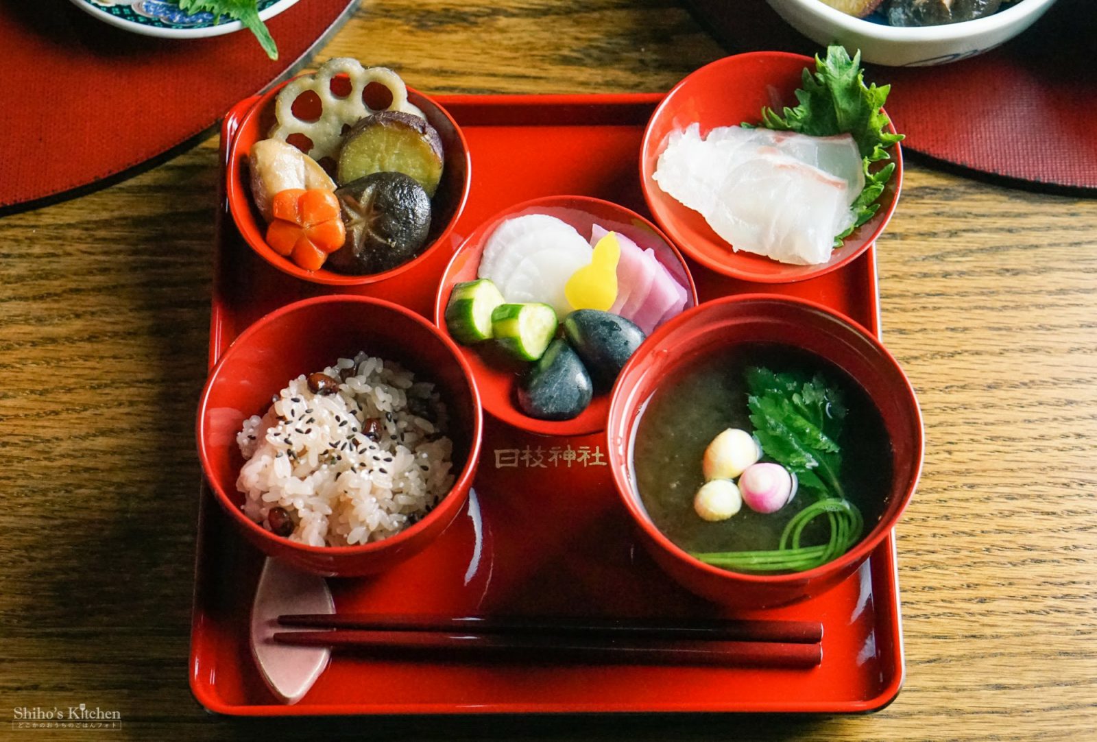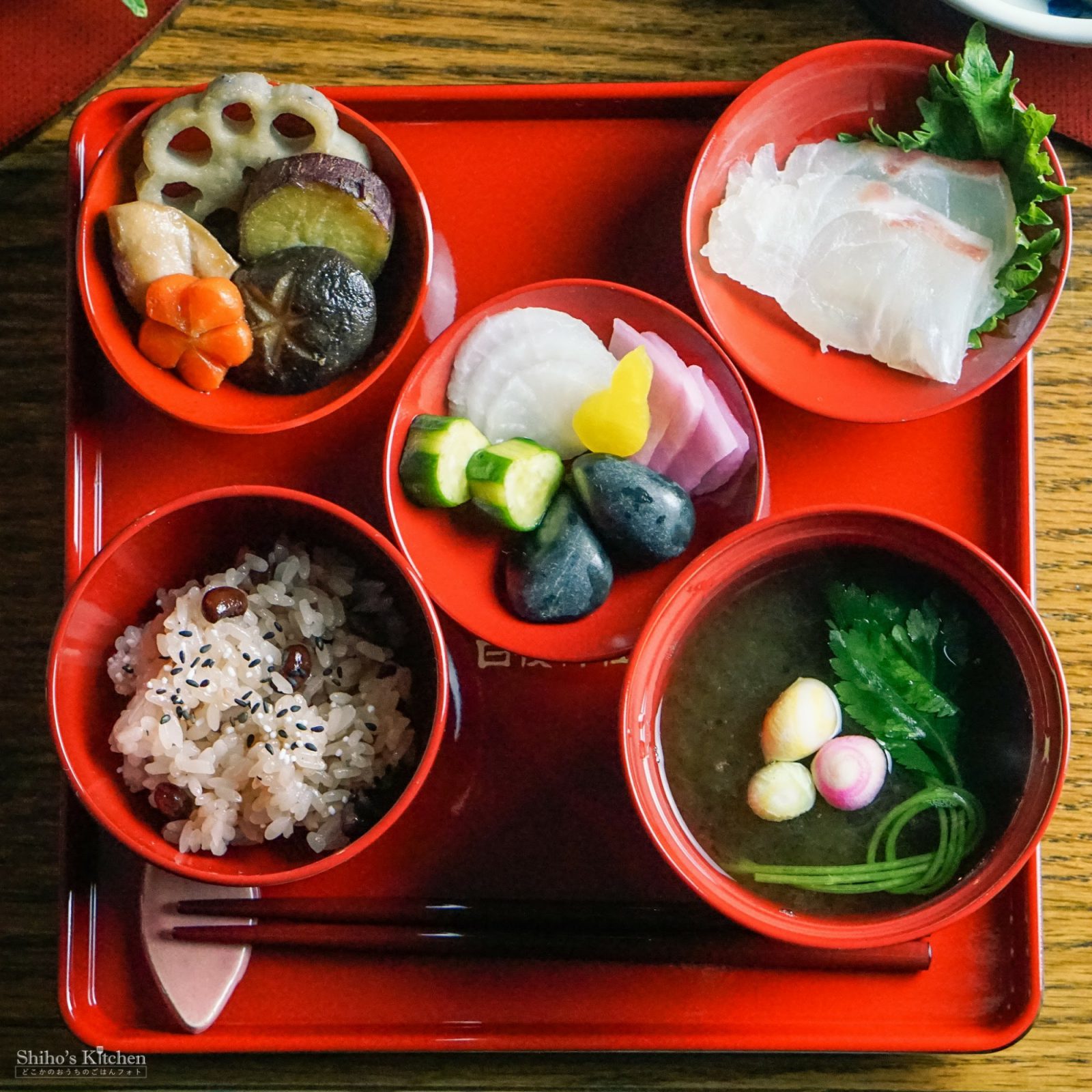 赤飯、お吸い物、煮物、香の物、鯛、歯固めの石、が基本らしいのですが、まず鯛一匹は手に入らなかったので、塩焼きの代わりにお刺身。