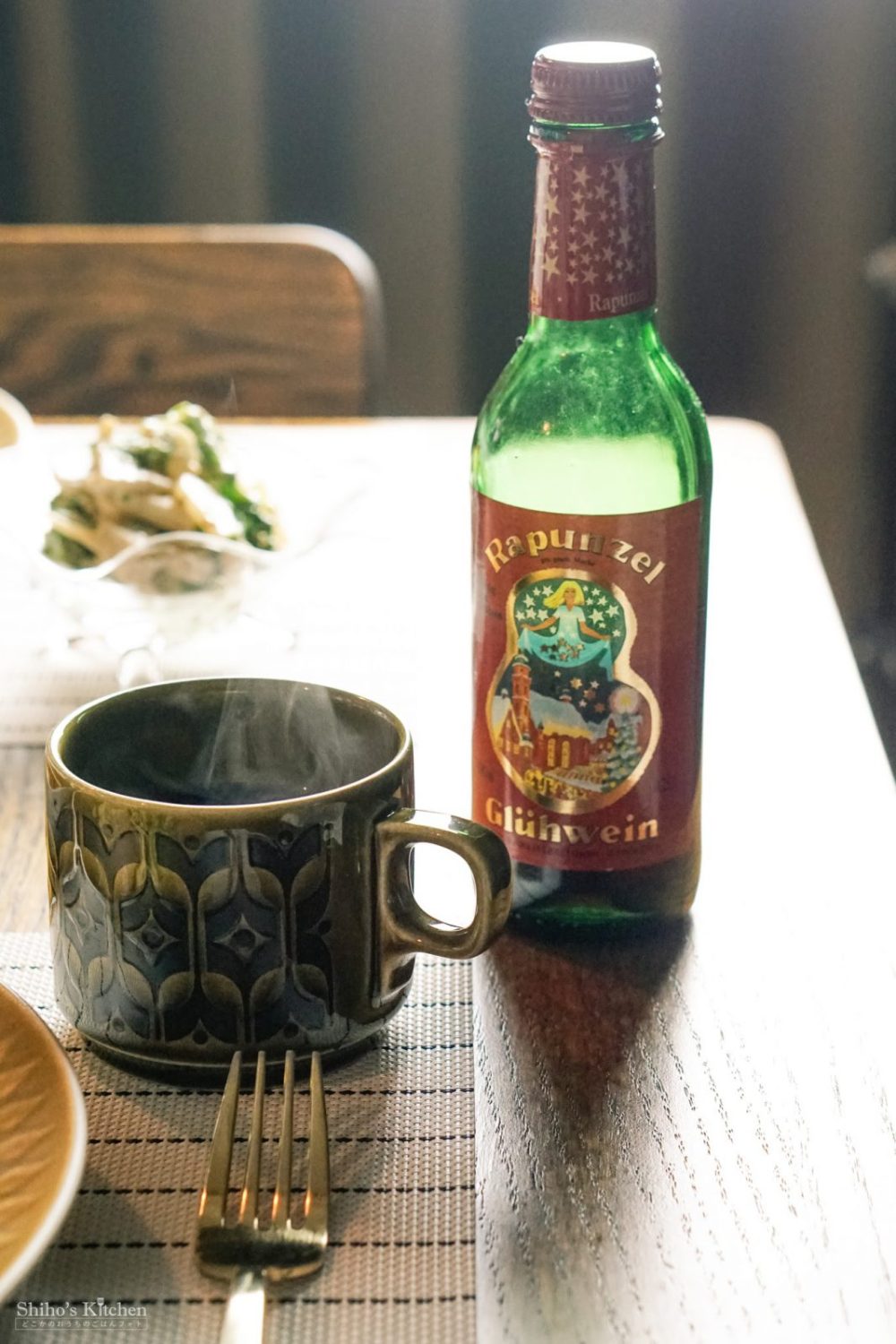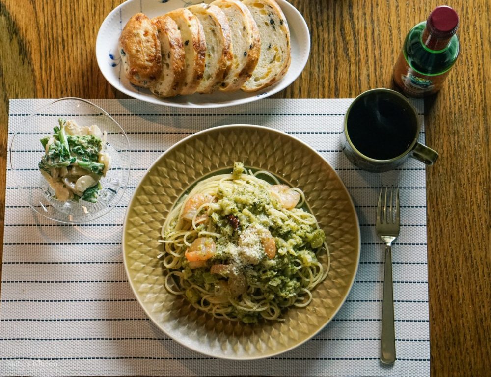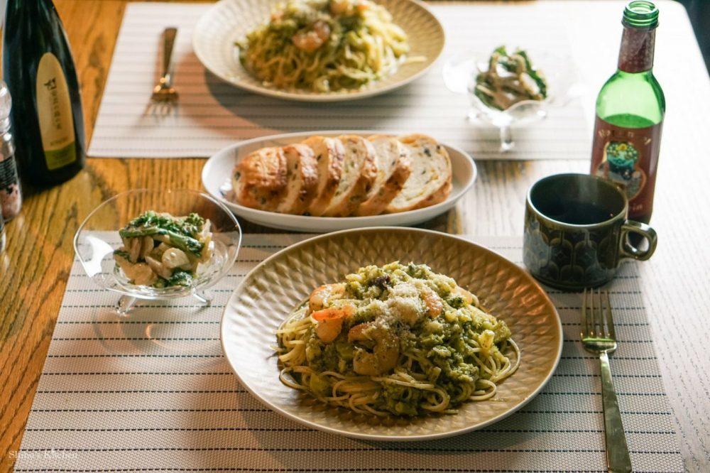 夫はグリューワインを出してましたが、海老とブロッコリーのパスタにはあんまり合わないような…?まぁ、雨で寒かったしね。