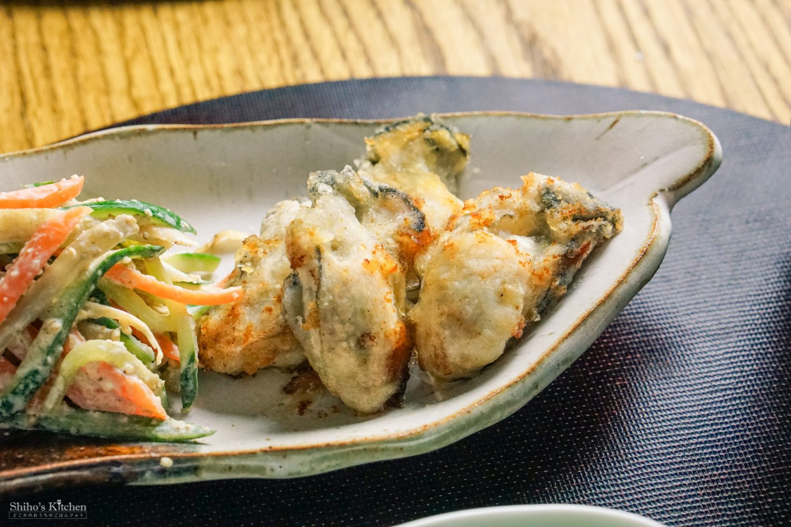牡蠣の竜田揚げはおろしニンニクととナンプラーに漬けて、片栗粉はたいて多めの油で揚げ焼き。