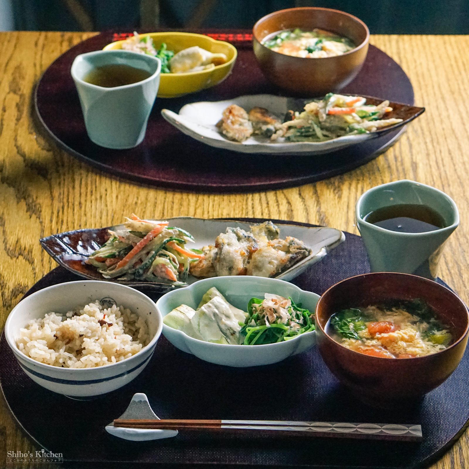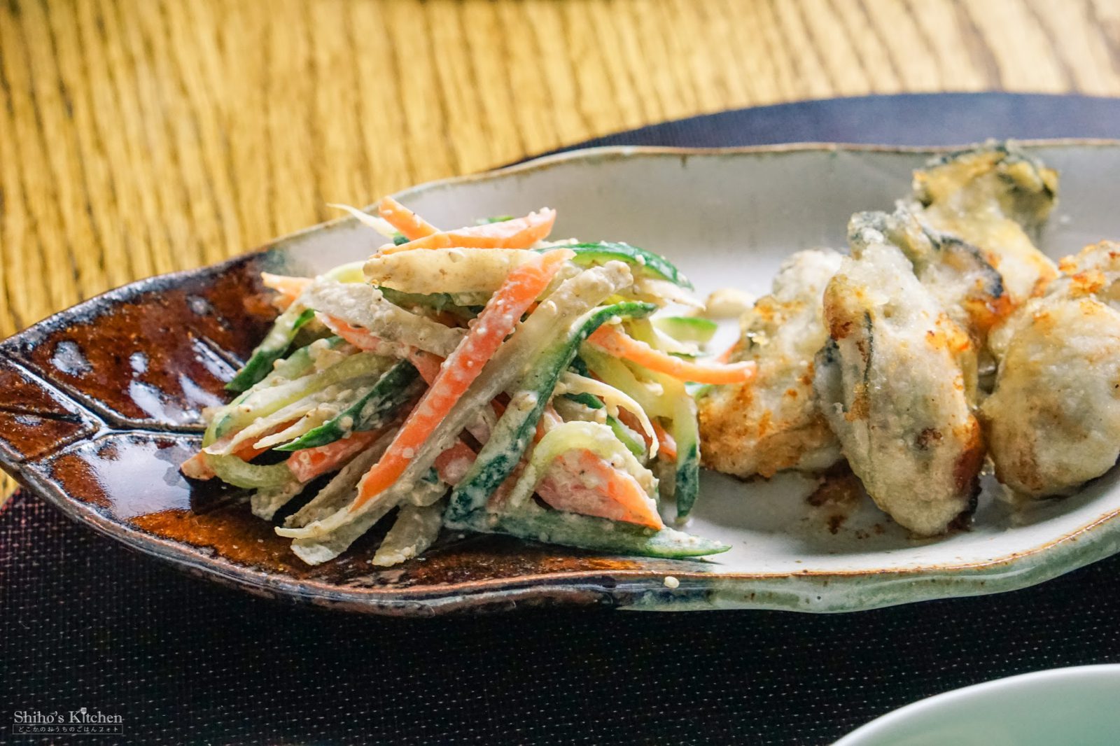 ごぼうサラダは、生で食べられるサラダごぼうをささがきにして、千切りキュウリと30秒くらいでさっと茹でた千切り人参とあわせて、すり胡麻・オイスターソース・マヨネーズ・砂糖塩コショウ少々で和えました。普通のごぼうでも、人参と一緒に湯通ししたらOK。