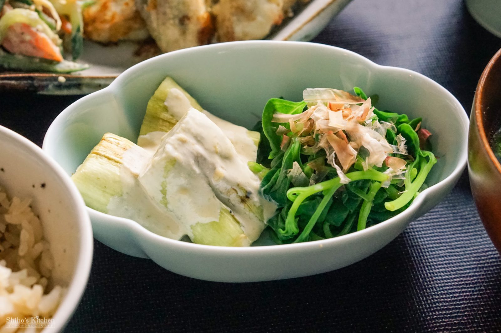 夫が生姜嫌いなので、練り胡麻で作る胡麻ダレで。かつおぶしと生姜醤油でも美味しいよ。