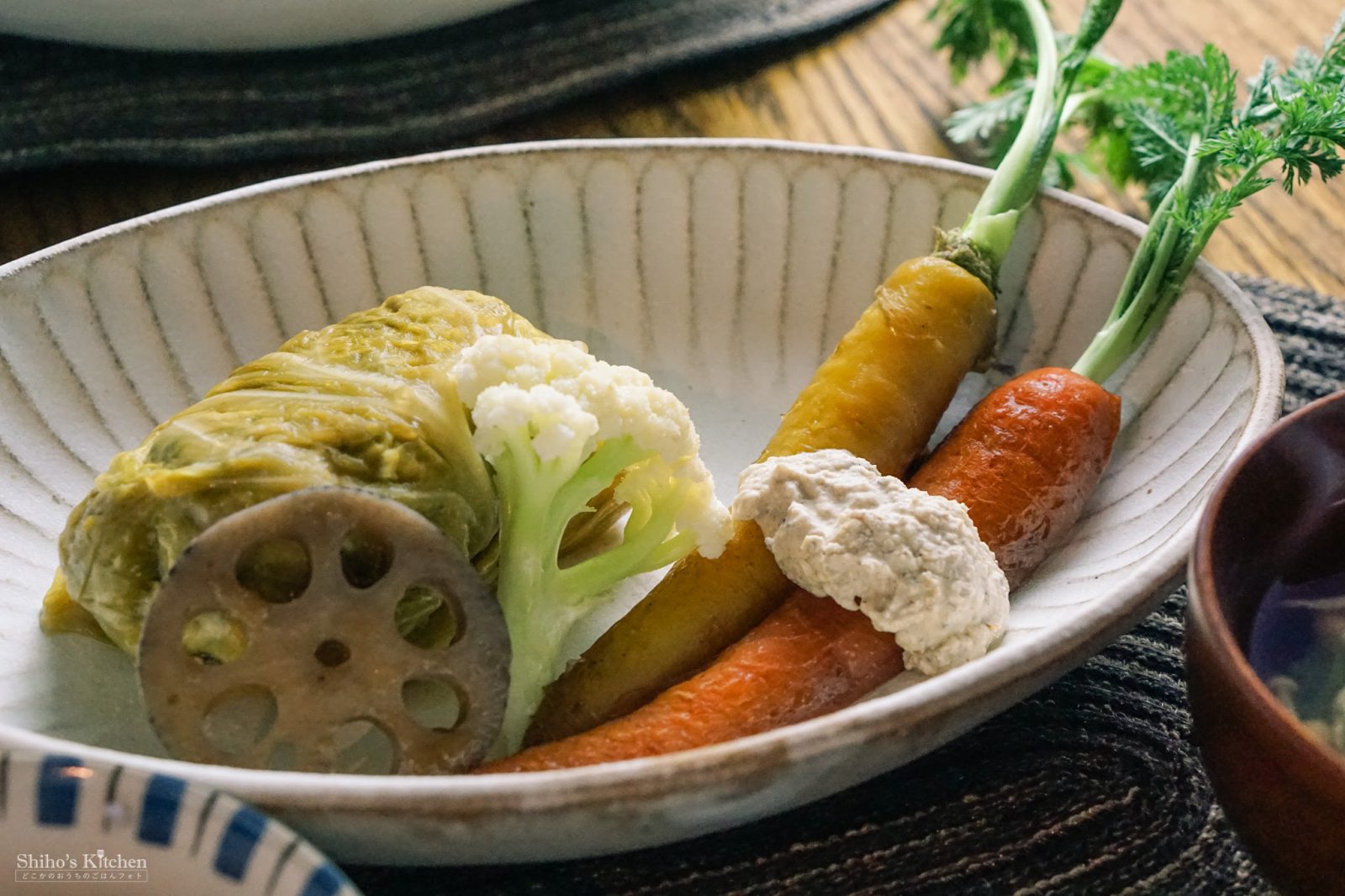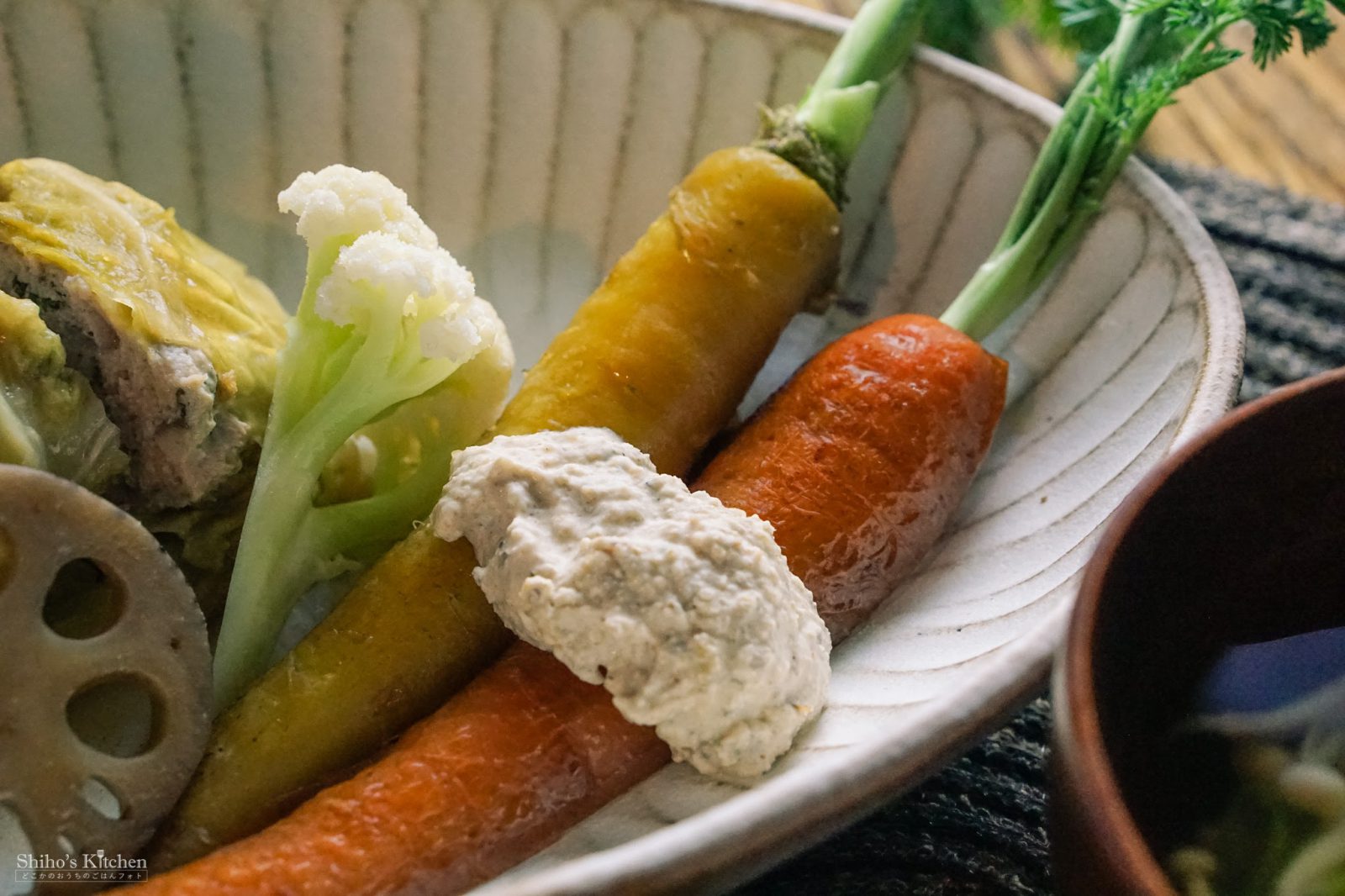 レミパンプラスを買ったので、敬意を込めて作ってみました。レミパンで丸ごと蒸し煮にした人参に、ミキサーで作った特製ソースをかけるだけ。