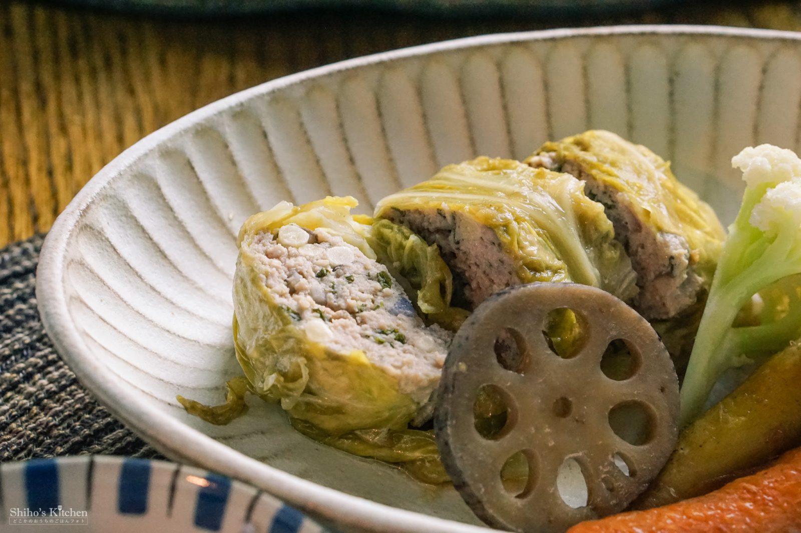 豚ひき肉に、レンコン・刻み大葉・白ごま・ローストした松の実を混ぜ込んで、豆乳に浸した鰹節とパン粉を足して、塩コショウで味付けしてよーくこねて、キャベツで巻いて生姜風味の出汁でグツグツして、片栗粉でとろみをつけて出来上がり。